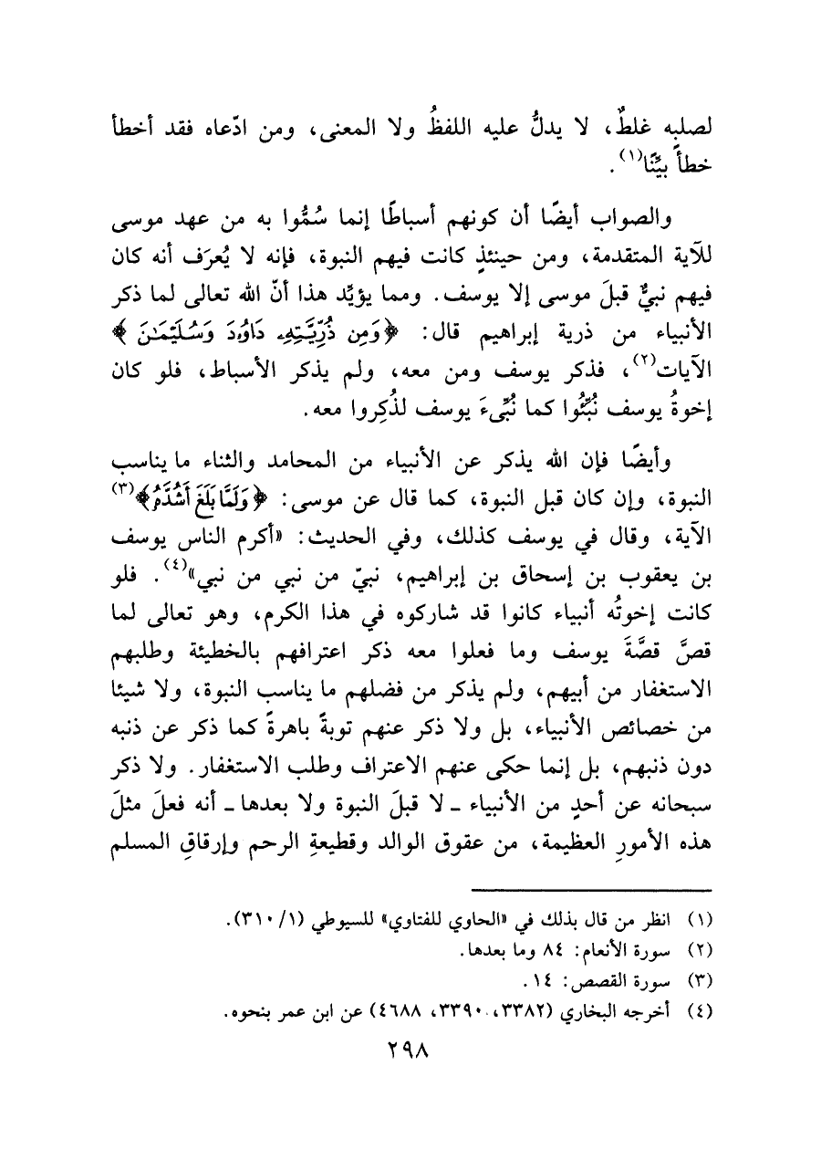 وأيضًا فإن الله يذكر عن الأنبياء من المحامد والثناء ما يناسب النبوة، وإن كان قبل النبوة، كما قال عن موسى: (وَلَمَّا بَلَغَ أَشُدَّهُ) (¬٣) الآية، وقال في يوسف كذلك، وفي الحديث: "أكرم الناس يوسف بن يعقوب بن إسحاق بن إبراهيم، نبيّ من نبي من نبي" (¬٤). فلو كانت إخوتُه أنبياء كانوا قد شاركوه في هذا الكرم، وهو تعالى لما قصَّ قصَّةَ يوسف وما فعلوا معه ذكر اعترافهم بالخطيئة وطلبهم الاستغفار من أبيهم، ولم يذكر من فضلهم ما يناسب النبوة، ولا شيئا من خصائص الأنبياء، بل ولا ذكر عنهم توبةً باهرةً كما ذكر عن ذنبه دون ذنبهم، بل إنما حكى عنهم الاعتراف وطلب الاستغفار. ولا ذكر سبحانه عن أحدٍ من الأنبياء -لا قبلَ النبوة ولا بعدها- أنه فعلَ مثلَ هذه الأمورِ العظيمة، من عقوق الوالد وقطيعةِ الرحم وإرقاقِ المسلم