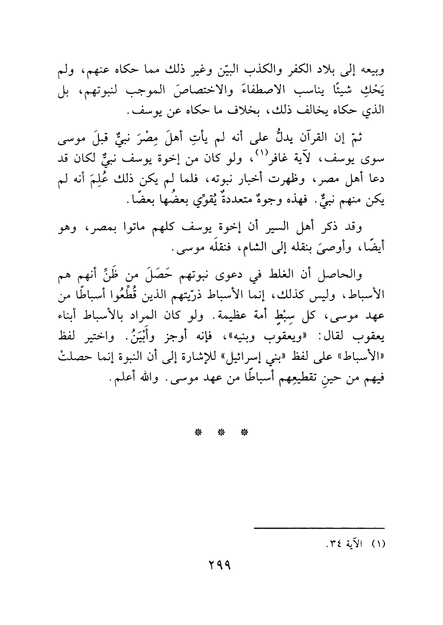 ثمّ إن القرآن يدلُّ على أنه لم يأتِ أهلَ مِصْرَ نبيٌّ قبلَ موسى سوى يوسف، لآية غافر (¬١)، ولو كان من إخوة يوسف نبيٌّ لكان قد دعا أهل مصر، وظهرت أخبار نبوته، فلما لم يكن ذلك عُلِمَ أنه لم يكن منهم نبيٌّ. فهذه وجوهٌ متعددة يُقوِّي بعضُها بعضًا.