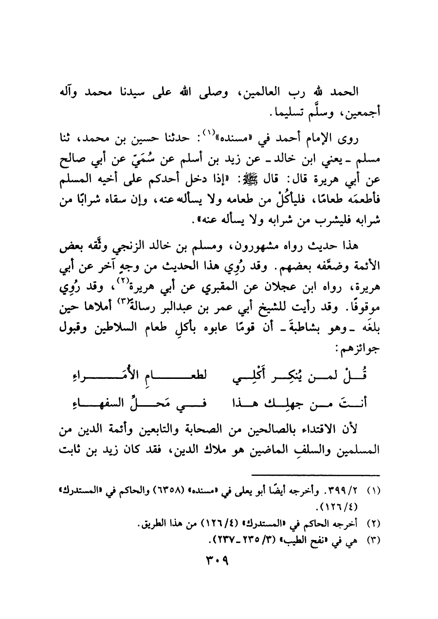 روى الإمام أحمد في "مسنده" (¬١): حدثنا حسين بن محمد، ثنا مسلم -يعني ابن خالد- عن زيد بن أسلم عن سُمَيّ عن أبي صالح عن أبي هريرة قال: قال - صَلَّى اللَّهُ عَلَيْهِ وَسَلَّمَ -: "إذا دخل أحدكم على أخيه المسلم فأطعمَه طعامًا، فليأكُلْ من طعامه ولا يسأله عنه، وإن سقاه شرابًا من شرابه فليشرب من شرابه ولا يسأله عنه".