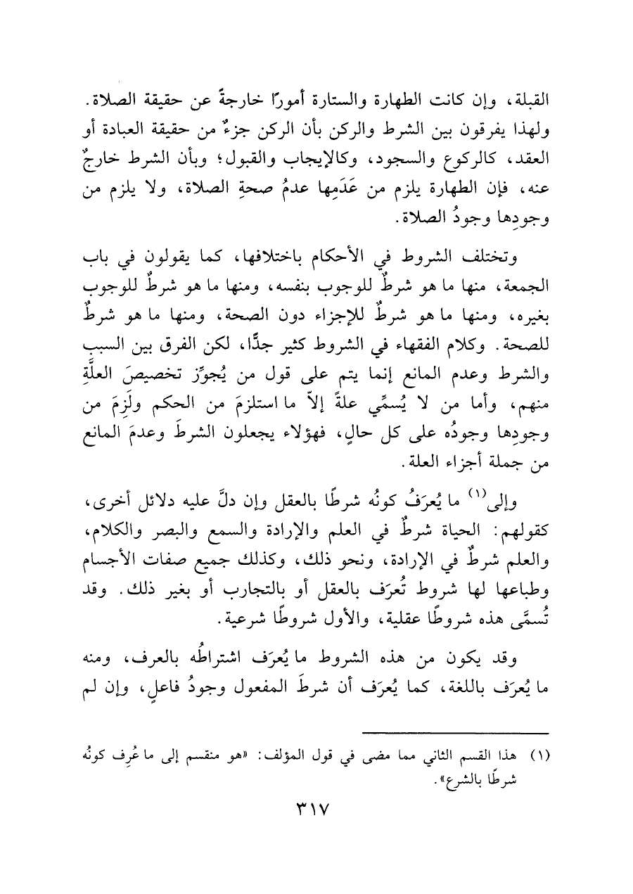 وإلى (¬١) ما يُعرَفُ كونُه شرطًا بالعقل وإن دلَّ عليه دلائل أخرى، كقولهم: الحياة شرط في العلم والإرادة والسمع والبصر والكلام، والعلم شرط في الإرادة، ونحو ذلك، وكذلك جميع صفات الأجسام وطباعها لها شروط تُعرَف بالعقل أو بالتجارب أو بغير ذلك. وقد تُسمَّى هذه شروطًا عقلية، والأول شروطًا شرعية.