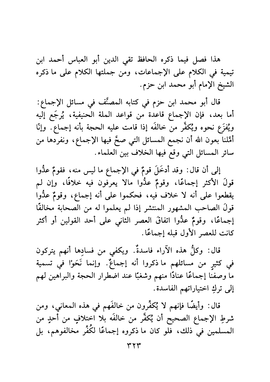هذا فصل فيما ذكره الحافظ تقي الدين أبو العباس أحمد ابن تيمية في الكلام على الإجماعات، ومن جملتها الكلام على ما ذكره الشيخ الإمام أبو محمد بن حزم.