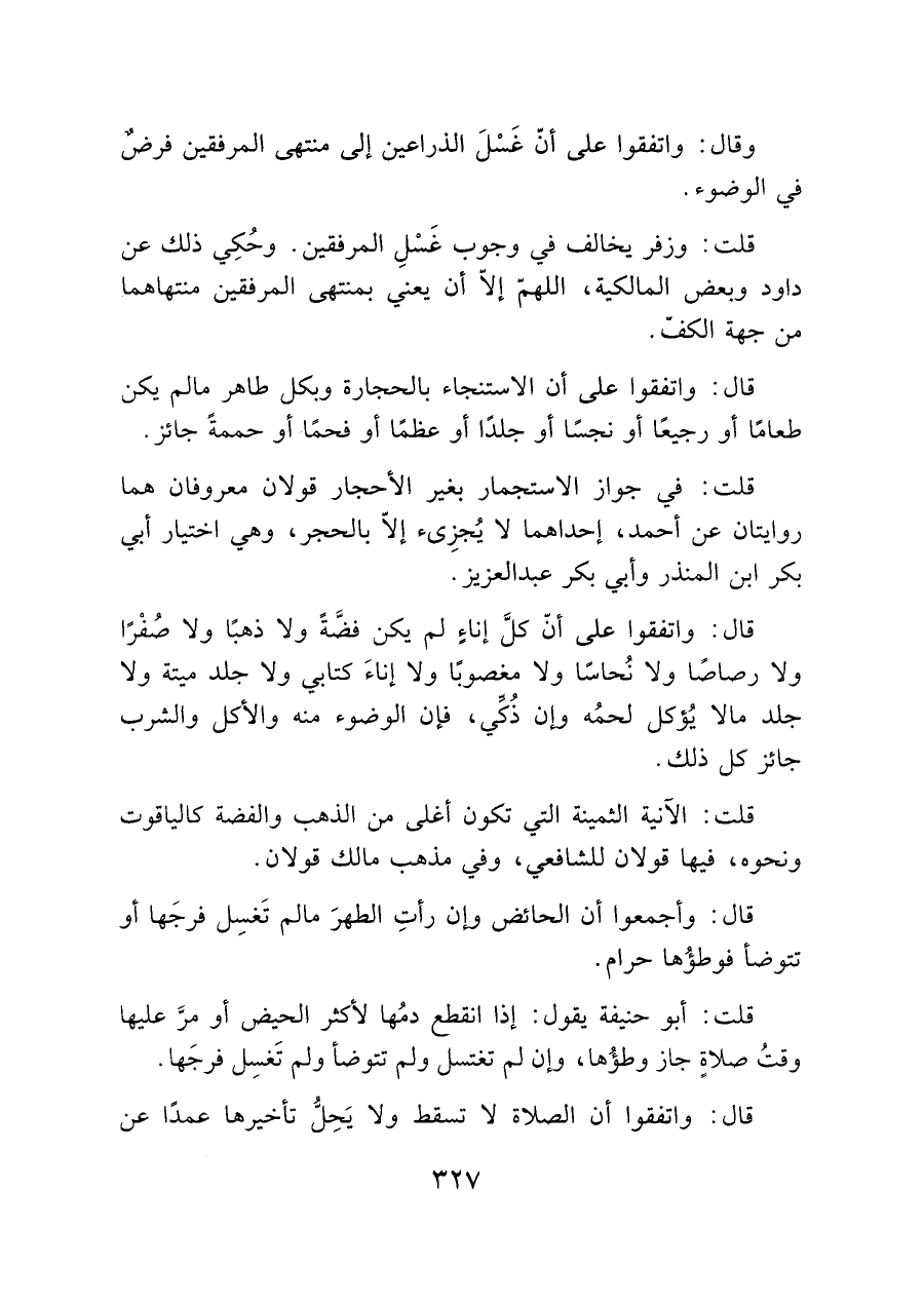 قلت: وزفر يخالف في وجوب غَسْلِ المرفقين. وحُكِي ذلك عن داود وبعض المالكية، اللهمّ إلا أن يعني بمنتهى المرفقين منتهاهما من جهة الكفّ.