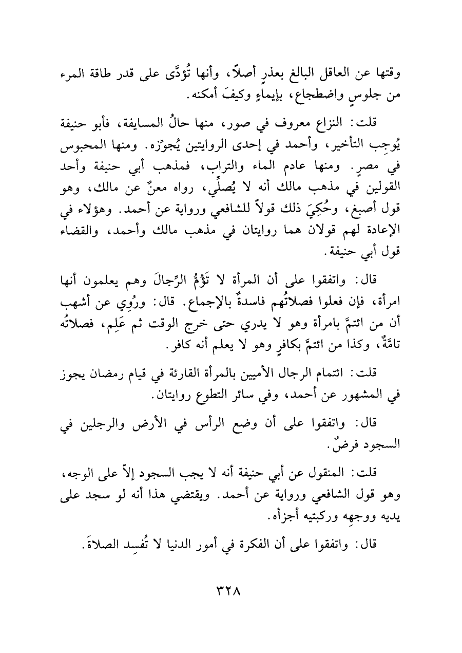 قال: واتفقوا على أن المرأة لا تَؤُمُّ الرِّجالَ وهم يعلمون أنها امرأة، فإن فعلوا فصلاتُهم فاسدة لا بالإجماع. قال: ورُوِي عن أشهب أن من ائتمَّ بامرأة وهو لا يدري حتى خرج الوقت ثم عَلِم، فصلاتُه تامَّةٌ، وكذا من ائتمَّ بكافرٍ وهو لا يعلم أنه كافر.