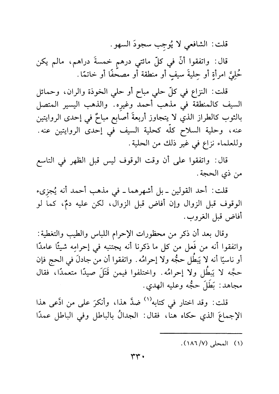 وقال بعد أن ذكر من محظورات الإحرام اللباس والطيب والتغطية: واتفقوا أنه من فَعل من كل ما ذكرنا أنه يجتنبه في إحرامِه شيئًا عامدًا أو ناسيًا أنه لا يَبطُل حجُّه ولا إحرامُه. واتفقوا أن من جادلَ في الحج فإن حجَّه لا يَبطُل ولا إحرامُه. واختلفوا فيمن قَتَلَ صيدًا متعمدًا، فقال مجاهد: بَطَلَ حجُّه وعليه الهدي.