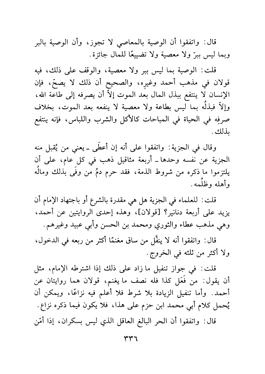 وقال في الجزية: واتفقوا على أنه إن أعطَى -يعني من يُقبل منه الجزية عن نفسه وحدها- أربعة مثاقيل ذهب في كل عام، على أن يلتزموا ما ذكره من شروط الذمة، فقد حرم دمُ من وفَى بذلك ومالُه وأهله وظلُمه.