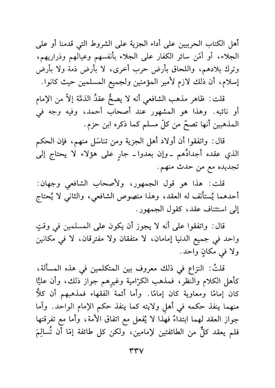 قال: واتفقوا على أنه لا يجوز أن يكون على المسلمين في وقتٍ واحد في جميع الدنيا إمامان، لا متفقان ولا مفترقان، لا في مكانين ولا في مكانٍ واحد.