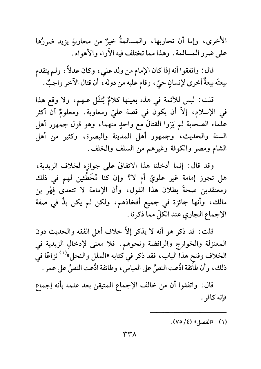 وقد قال: إنما أدخلنا هذا الاتفاقَ على جوازِه لخلاف الزيدية، هل تجوز إمامة غير علويّ أم لا؟ وإن كنا مُخَطِّئين لهم في ذلك ومعتقدين صحةَ بطلان هذا القول، وأن الإمامة لا تتعدى فِهْر بن مالك، وأنها جائزة في جميع أفخاذهم، ولكن لم يكن بذٌ في صفة الإجماع الجاري عند الكلّ مما ذكرنا.