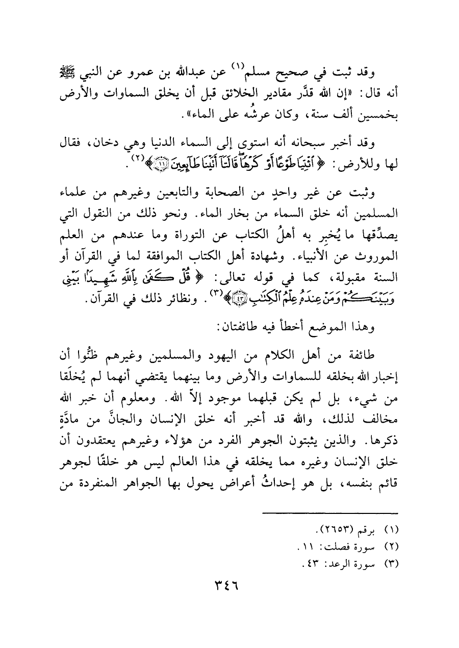 وثبت عن غير واحدٍ من الصحابة والتابعين وغيرهم من علماء المسلمين أنه خلق السماء من بخار الماء. ونحو ذلك من النقول التي يصدِّقها ما يُخبِر به أهلُ الكتاب عن التوراة وما عندهم من العلم الموروث عن الأنبياء. وشهادة أهل الكتاب الموافقة لما في القرآن أو السنة مقبولة، كما في قوله تعالى: (قُلْ كَفَى بِاللَّهِ شَهِيدًا بَيْنِي وَبَيْنَكُمْ وَمَنْ عِنْدَهُ عِلْمُ الْكِتَابِ (٤٣)) (¬٣). ونظائر ذلك في القرآن.