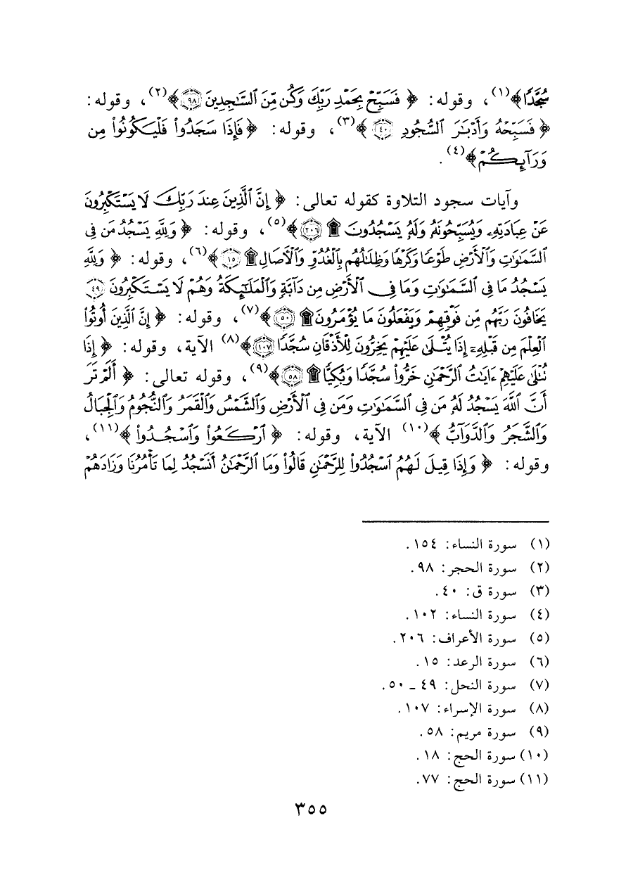 وآيات سجود التلاوة كقوله تعالى: (إِنَّ الَّذِينَ عِنْدَ رَبِّكَ لا يَسْتَكْبِرُونَ عَنْ عِبَادَتِهِ وَيُسَبِّحُونَهُ وَلَهُ يَسْجُدُونَ (٢٠٦)) (¬٥)، وقوله: (وَلِلَّهِ يَسْجُدُ مَنْ فِي السَّمَاوَاتِ وَالْأَرْضِ طَوْعًا وَكَرْهًا وَظِلالُهُمْ بِالْغُدُوِّ وَالْآصَالِ (١٥)) (¬٦)، وقوله: (وَلِلَّهِ يَسْجُدُ مَا فِي السَّمَاوَاتِ وَمَا فِي الْأَرْضِ مِنْ دَابَّةٍ وَالْمَلائِكَةُ وَهُمْ لا يَسْتَكْبِرُونَ (٤٩) يَخَافُونَ رَبَّهُمْ مِنْ فَوْقِهِمْ وَيَفْعَلُونَ مَا يُؤْمَرُونَ (٥٠)) (¬٧)، وقوله: (إِنَّ الَّذِينَ أُوتُوا الْعِلْمَ مِنْ قَبْلِهِ إِذَا يُتْلَى عَلَيْهِمْ يَخِرُّونَ لِلْأَذْقَانِ سُجَّدًا (١٠٧)) (¬٨) الآية، وقوله: (إِذَا تُتْلَى عَلَيْهِمْ آيَاتُ الرَّحْمَنِ خَرُّوا سُجَّدًا وَبُكِيًّا (٥٨)) (¬٩)، وقوله تعالى: (أَلَمْ تَرَ أَنَّ اللَّهَ يَسْجُدُ لَهُ مَنْ فِي السَّمَاوَاتِ وَمَنْ فِي الْأَرْضِ وَالشَّمْسُ وَالْقَمَرُ وَالنُّجُومُ وَالْجِبَالُ وَالشَّجَرُ وَالدَّوُابُّ) (¬١٠) الآية، وقوله: (ارْكَعُوا وَاسْجُدُوا) (¬١١)، وقوله: (وَإِذَا قِيلَ لَهُمُ اسْجُدُوا لِلرَّحْمَنِ قَالُوا وَمَا الرَّحْمَنُ أَنَسْجُدُ لِمَا تَأْمُرُنَا وَزَادَهُمْ