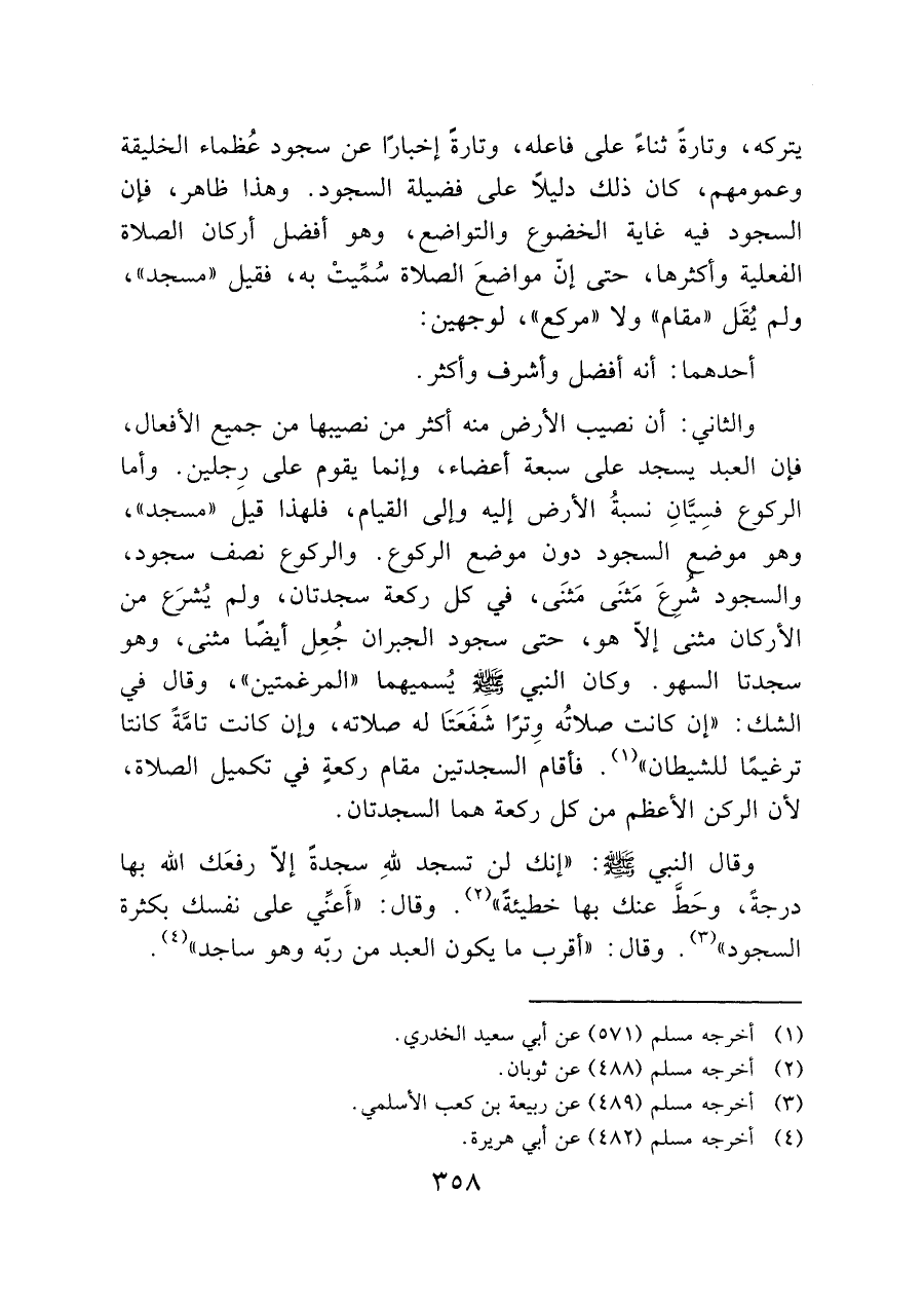 وقال النبي - صَلَّى اللَّهُ عَلَيْهِ وَسَلَّمَ -: "إنك لن تسجد لله سجدة إلا رفعَك الله بها درجةً، وحَطَّ عنك بها خطيئةً" (¬٢). وقال: "أَعنِّي على نفسك بكثرة السجود" (¬٣). وقال: "أقرب ما يكون العبد من ربه وهو ساجد" (¬٤).