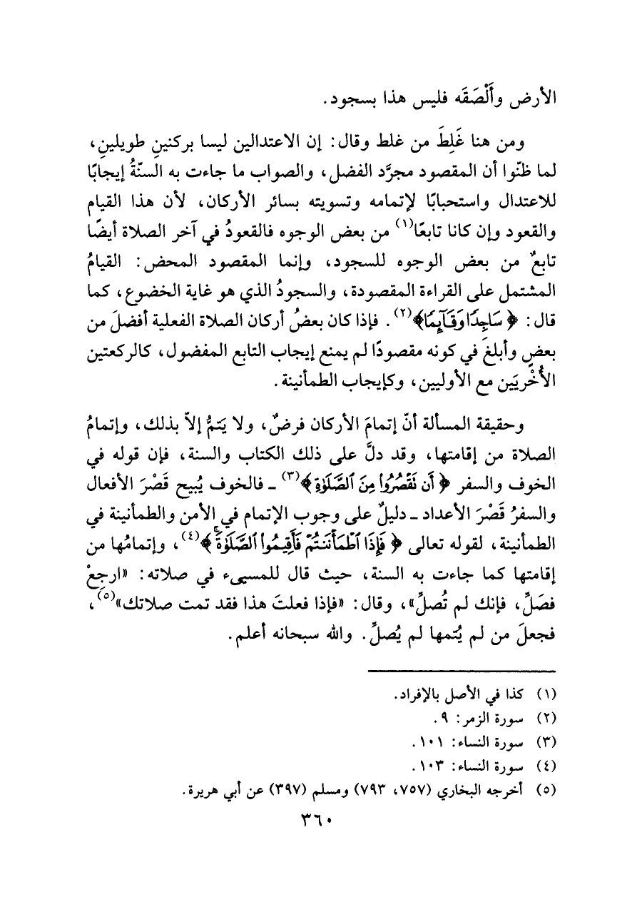 وحرف المسألة أنّ إتمامَ الأركان فرضٌ، ولا يَتمُّ إلا بذلك، وإتمامُ الصلاة من إقامتها، وقد دلَّ على ذلك الكتاب والسنة، فإن قوله في الخوف والسفر (أَنْ تَقْصُرُوا مِنَ الصَّلاةِ) (¬٣) -فالخوف يُبيح قَصْرَ الأفعال والسفرُ قَصْرَ الأعداد- دليلٌ على وجوب الإتمام في الأمن والطمأنينة في الطمأنينة، لقوله تعالى (فَإِذَا اطْمَأْنَنْتُمْ فَأَقِيمُوا الصَّلاةَ) (¬٤)، وإتمامُها من إقامتها كما جاءت به السنة، حيث قال للمسيئ في صلاته: "ارجِعْ فصَلِّ، فإنك لم تُصلِّ"، وقال: "فإذا فعلتَ هذا فقد تمت صلاتك" (¬٥)، فجعلَ من لم يُتمها لم يُصلِّ. والله سبحانه أعلم.
