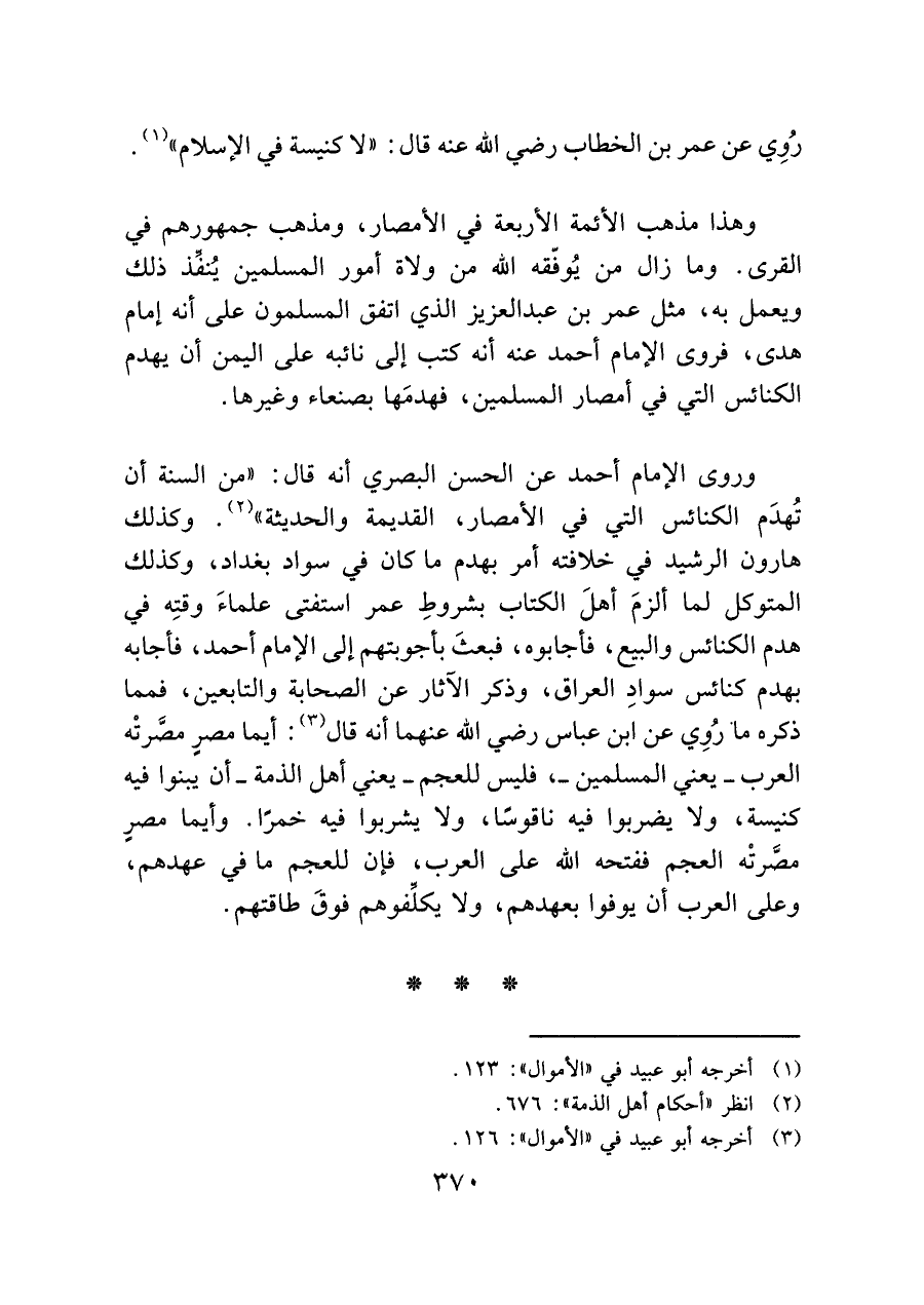 وهذا مذهب الأئمة الأربعة في الأمصار، ومذهب جمهورهم في القرى. وما زال من يُوفّقه الله من ولاة أمور المسلمين يُنقذ ذلك ويعمل به، مثل عمر بن عبد العزيز الذي اتفق المسلمون على أنه إمام هدى، فروى الإمام أحمد عنه أنه كتب إلى نائبه عن اليمن أن يهدم الكنائس التي في أمصار المسلمين، فهدمَها بصنعاء وغيرها.