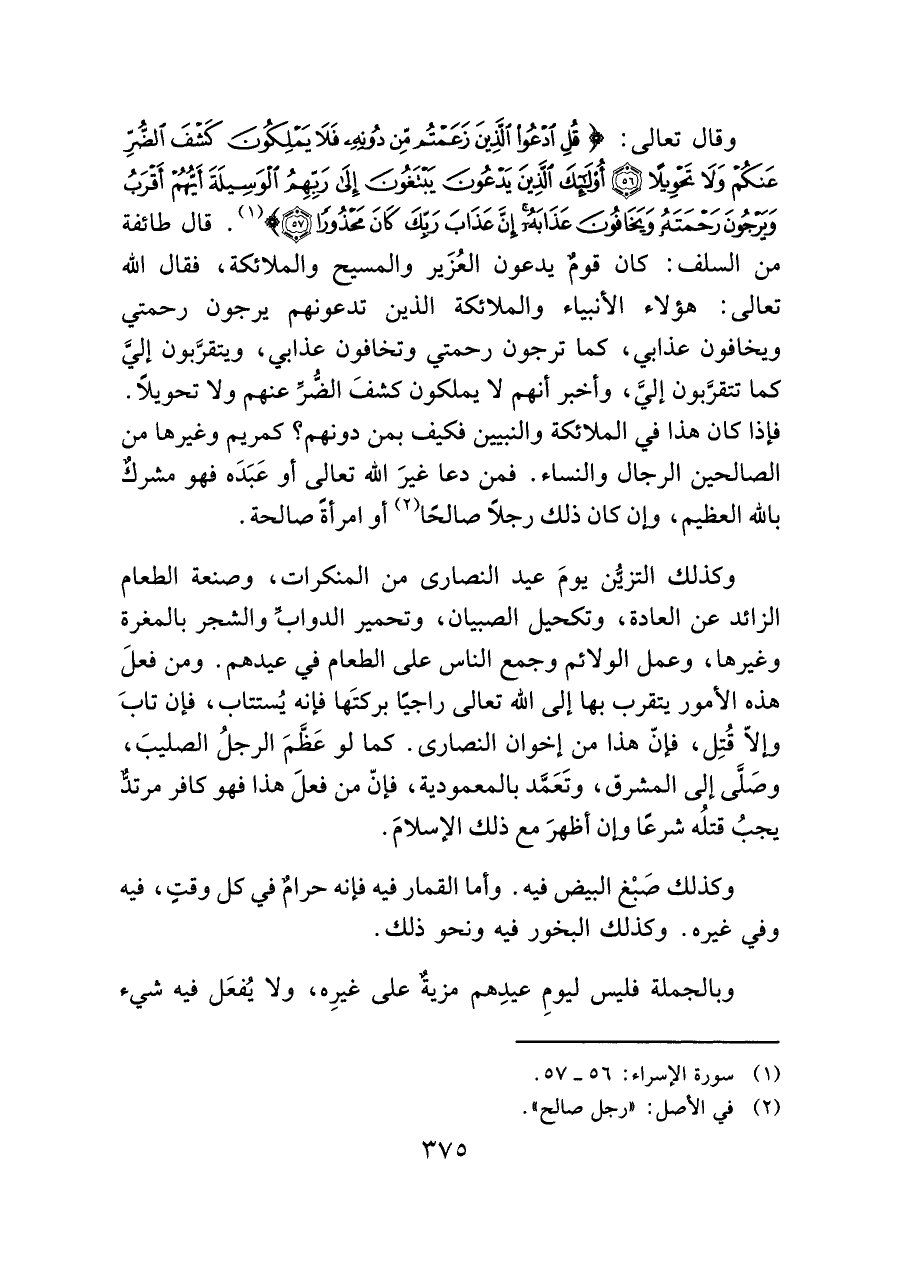 وقال تعالى: (قُلِ ادْعُوا الَّذِينَ زَعَمْتُمْ مِنْ دُونِهِ فَلا يَمْلِكُونَ كَشْفَ الضُّرِّ عَنْكُمْ وَلا تَحْوِيلًا (٥٦) أُولَئِكَ الَّذِينَ يَدْعُونَ يَبْتَغُونَ إِلَى رَبِّهِمُ الْوَسِيلَةَ أَيُّهُمْ أَقْرَبُ وَيَرْجُونَ رَحْمَتَهُ وَيَخَافُونَ عَذَابَهُ إِنَّ عَذَابَ رَبِّكَ كَانَ مَحْذُورًا (٥٧)) (¬١). قال طائفة من السلف: كان قومٌ يدعون العُزَير والمسيح والملائكة، فقال الله تعالى: هؤلاء الأنبياء والملائكة الذين تدعونهم يرجون رحمتي ويخافون عذابي، كما ترجون رحمتي وتخافون عذابي، ويتقرَّبون إليَّ كما تتقرَّبون إليَّ، وأخبر أنهم لا يملكون كشفَ الضرَّ عنهم ولا تحويلًا.