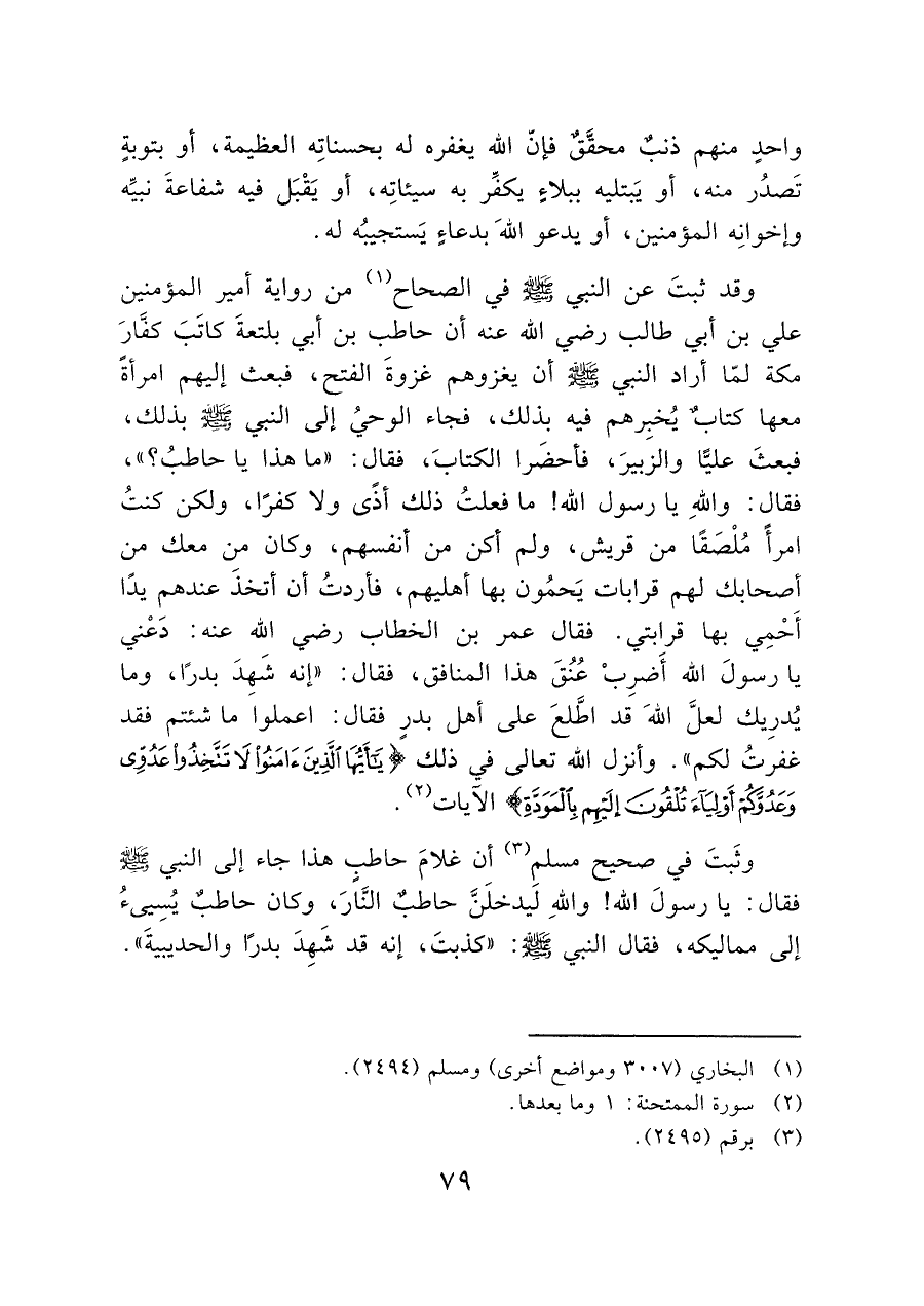 وقد ثبتَ عن النبي - صَلَّى اللَّهُ عَلَيْهِ وَسَلَّمَ - في الصحاح (¬١) من رواية أمير المؤمنين علي بن أبي طالب رضي الله عنه أن حاطب بن أبي بلتعةَ كاتَبَ كفَّارَ مكة لمّا أراد النبي - صَلَّى اللَّهُ عَلَيْهِ وَسَلَّمَ - أن يغزوهم غزوةَ الفتح، فبعث إليهم امرأةً معها كتابٌ يُخبِرهم فيه بذلك، فجاء الوحيُ إلى النبي - صَلَّى اللَّهُ عَلَيْهِ وَسَلَّمَ - بذلك، فبعثَ عليًّا والزبيرَ، فأحضَرا الكتابَ، فقال: "ما هذا يا حاطبُ؟ "، فقال: والله يا رسول الله! ما فعلتُ ذلك أذًى ولا كفرًا، ولكن كنتُ امرأ مُلْصَقًا من قريش، ولم أكن من أنفسهم، وكان من معك من أصحابك لهم قرابات يَحمُون بها أهليهم، فأردتُ أن أتخذَ عندهم يدًا أَحْمِي بها قرابتي. فقال عمر بن الخطاب رضي الله عنه: دَعْني يا رسولَ الله أَضرِبْ عُنُقَ هذا المنافق، فقال: "إنه شَهِدَ بدرًا، وما يُدرِيك لعلَّ الله قد اطَّلعَ على أهل بدر فقال: اعملوا ما شئتم فقد غفرتُ لكم". وأنزل الله تعالى في ذلك (يَا أَيُّهَا الَّذِينَ آمَنُوا لا تَتَّخِذُوا عَدُوِّي وَعَدُوَّكُمْ أَوْلِيَاءَ تُلْقُونَ إِلَيْهِمْ بِالْمَوَدَّةِ) الآيات (¬٢).
