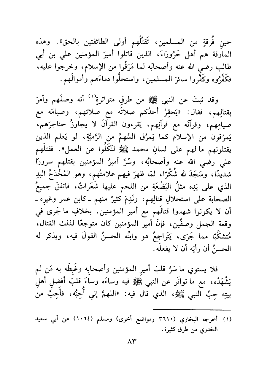 وقد ثبتَ عن النبي - صَلَّى اللَّهُ عَلَيْهِ وَسَلَّمَ - من طرقٍ متواترةٍ (¬١) أنه وصفَهم وأمرَ بقتالِهم، فقال: "يَحقِرُ أحدُكم صلاتَه مع صلاتهم، وصيامَه مع صيامِهم، وقرأنه مع قرآنِهم، يَقرءون القرآنَ لا يجاوزُ حناجرَهم، يَمرُقون من الإسلام كما يَمرُق السَّهمُ من الرَّميَّةِ، لو يَعلم الذين يقتلونهم مالهم على لسانِ محمد - صَلَّى اللَّهُ عَلَيْهِ وَسَلَّمَ - لنَكَلُوا عن العمل". فقتلَهم علي رضي الله عنه وأصحابُه، وسُرَّ أميرُ المؤمنين بقتلهم سرورًا شديدًا، وسَجَدَ الله شُكْرًا، لمّا ظهرَ فيهم علامتُهم، وهو المُخْدَجُ اليدِ الذي على يَدِه مثلُ البَضْعَةِ من اللحم عليها شَعَراتٌ، فاتفقَ جميعُ الصحابة على استحلالِ قتالِهم، ونَدِمَ كثير منهم -كابن عمر وغيرِه- أن لا يكونوا شهدوا قتالَهم مع أمير المؤمنين. بخلافِ ما جَرى في وقعة الجمل وصفِّين، فإنّ أمير المؤمنين كان متوجعًا لذلك القتال، مُتشكِّيًا مما جَرَى، يَتَراجِعُ هو وابنُه الحسنُ القولَ فيه، ويذكر له الحسنُ أن رأيَه أن لا يفعله.