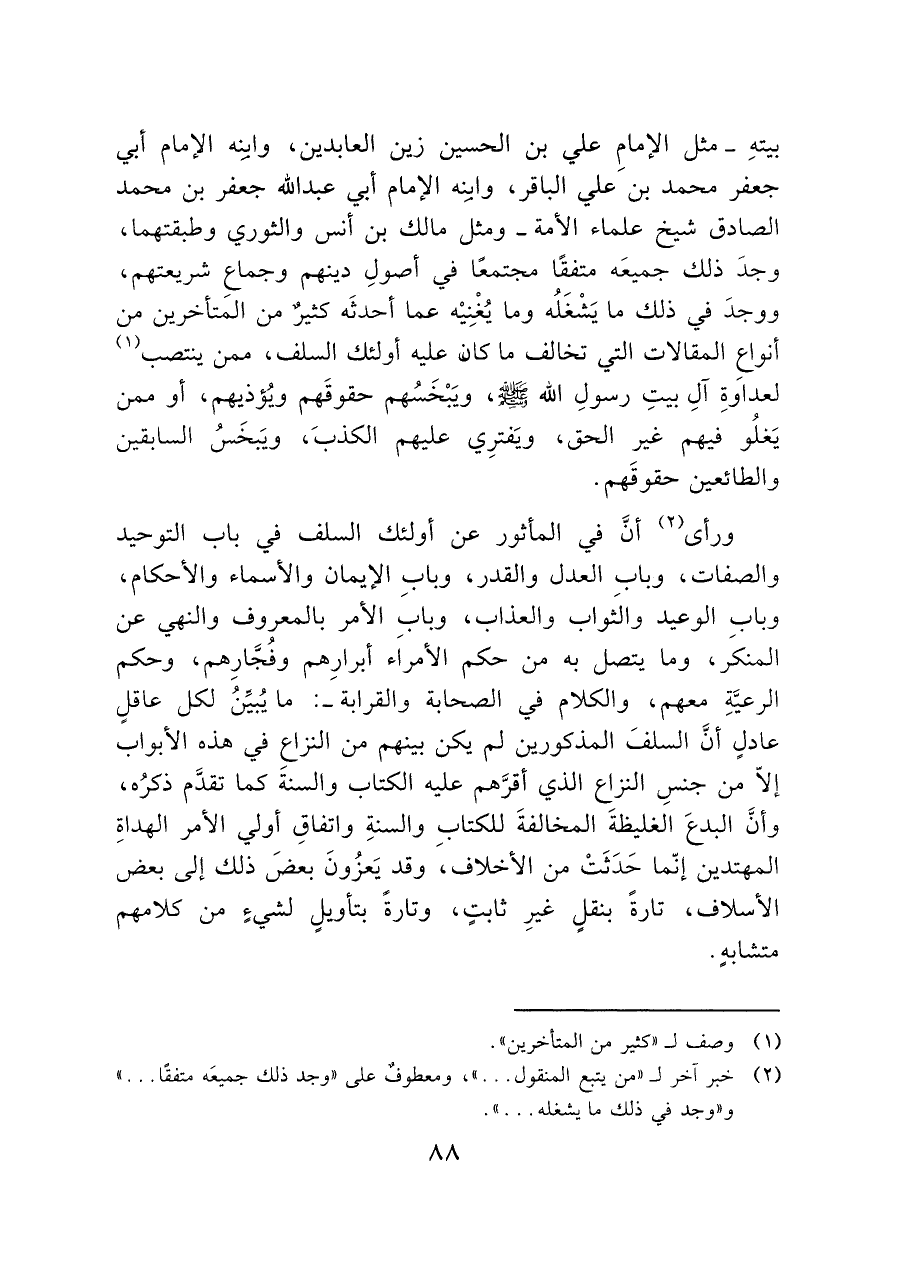 ورأى (¬٢) أنَ في المأثور عن أولئك السلف في باب التوحيد والصفات، وباب العدل والقدر، وباب الإيمان والأسماء والأحكام، وباب الوعيد والثَّواب والعذاب، وبابَ الأمر بالمعروف والنهي عن المنكَر، وما يتصل به من حكم الأمراَء أبرارِهم وفُجَّارِهم، وحكم الرعيَّةِ معهم، والكلام في الصحابة والقرابة-: ما يُبيِّنُ لكل عاقلٍ عادلٍ أنَّ السلفَ المذكورين لم يكن بينهم من النزاع في هذه الأبواب إلا من جنسِ النزاع الذي أقرَّهم عليه الكتاب والسنةَ كما تقدَّم ذكرُه، وأنَّ البدعَ الغليظةَ المخالفةَ للكتابِ والسنةِ واتفاقِ أولي الأمر الهداةِ المهتدين إنّما حَدَثَتْ من الأخلاف، وقد يَعزُونَ بعضَ ذلك إلى بعض الأسلاف، تارةً بنقل غيرِ ثابتٍ، وتارةً بتأويلٍ لشيءٍ من كلامهم متشابهٍ.