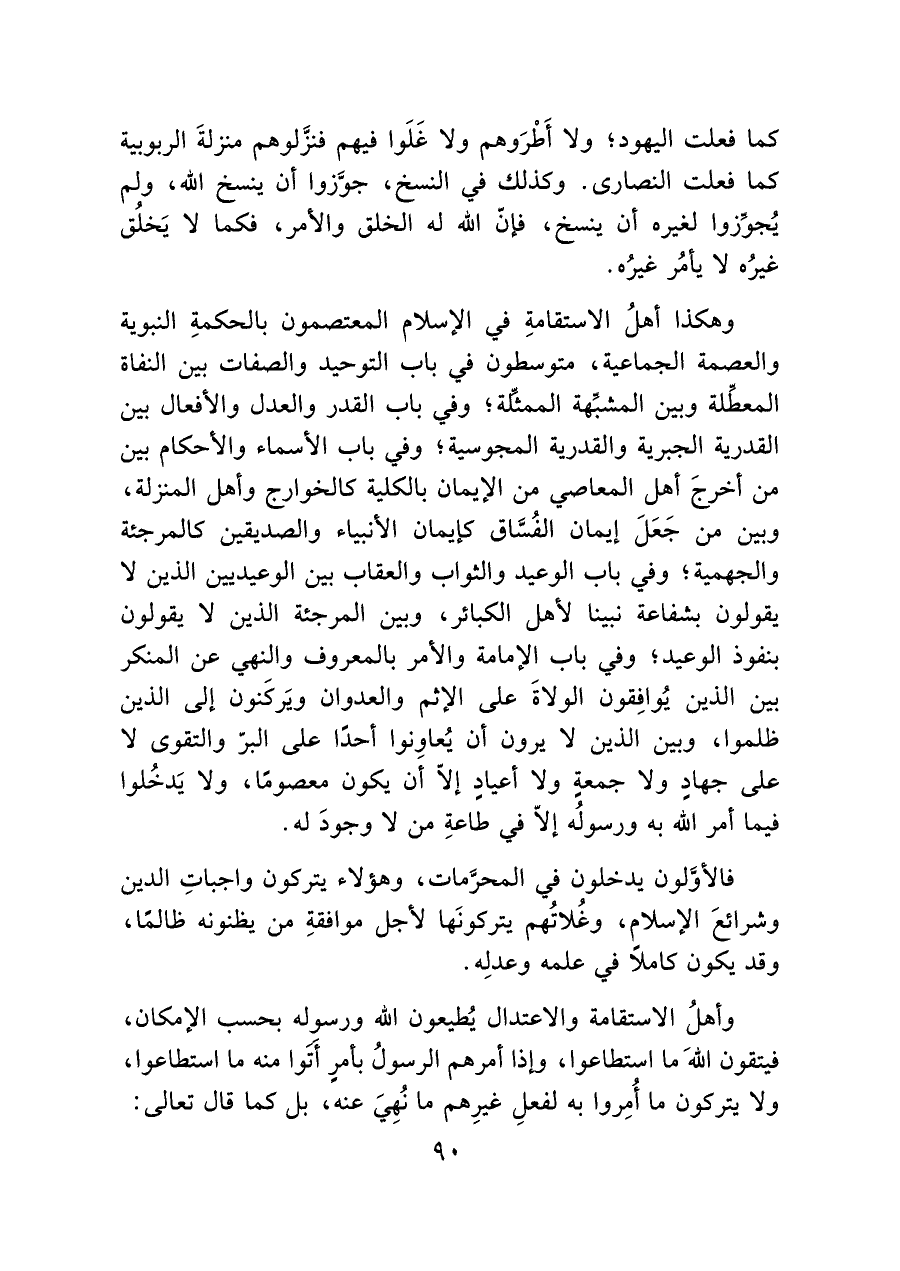 وهكذا أهلُ الاستقامةِ في الإسلام المعتصمون بالحكمةِ النبوية والعصمة الجماعية، متوسطون في باب التوحيد والصفات بين النفاة المعطِّلة وبين المشبِّهة الممثِّلة، وفي باب القدر والعدل والأفعال بين القدرية الجبرية والقدرية المجوسية، وفي باب الأسماء والأحكام بين من أخرجَ أهل المعاصي من الإيمان بالكلية كالخوارج وأهل المنزلة، وبين من جَعَلَ إيمان الفُسَّاق كإيمان الأنبياء والصديقين كالمرجئة والجهمية، وفي باب الوعيد والثواب والعقاب بين الوعيديين الذين لا يقولون بشفاعة نبينا لأهل الكبائر، وبين المرجئة الذين لا يقولون بنفود الوعيد، وفي باب الإمامة والأمر بالمعروف والنهي عن المنكر بين الذين يُوافِقون الولاةَ على الإثم والعدوان ويَركَنون إلى الذين ظلموا، وبين الذين لا يرون أن يُعاوِنوا أحدًا على البرّ والتقوى لا على جهادٍ ولا جمعةٍ ولا أعيادٍ إلا أن يكون معصومًا، ولا يَدخُلوا فيما أمر الله به ورسولُه إلا في طاعةِ من لا وجودَ له.