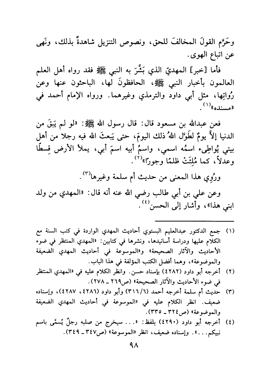 (¬١) جمع الدكتور عبد العليم البستوي أحاديث المهدي الواردة في كتب السنة مع الكلام عليها ودراسة أسانيدها، ونشرها في كتابين: "المهدي المنتظر في ضوء الأحاديث والآثار الصحيحة" و"الموسوعة في أحاديث المهدي الضعيفة والموضوعة"، وهما أفضل الكتب المؤلفة في هذا الباب.