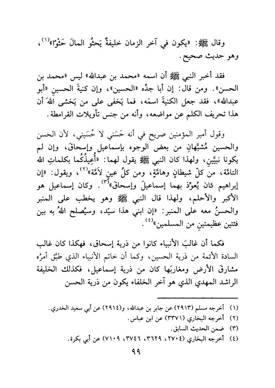 فكما أن غالبَ الأنبياء كانوا من ذرية إسحاق، فهكذا كان غالب السادة الأئمة من ذرية الحسين، وكما أن خاتم الأنبياء الذي طبَّق أمرُه مشارقَ الأرض ومغاربَها كان من ذرية إسماعيل، فكذلك الخليفة الراشد المهدي الذي هو آخر الخلفاء يكون من ذرية الحسن.