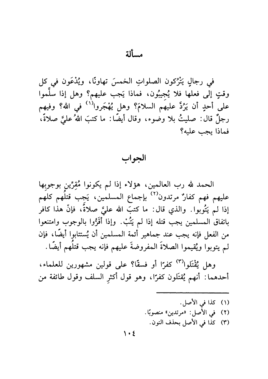 الحمد لله رب العالمين، هؤلاء إذا لم يكونوا مُقِرِّين بوجوبِها عليهم فهم كفارٌ مرتدون (¬١) بإجماع المسلمين، يَجب قتلُهم كلهم إذا لم يَتُوبوا. والذي قال: ما كتبَ الله عليَّ صلاةً، فإن هذا كافر باتفاق المسلمين يجب قتله إذا لم يَتُبْ. وإذا أقَرُّوا بالوجوب وامتنعوا من الفعل فإنه يجب عند جماهير أئمة المسلمين أن يُستتابوا أيضًا، فإن لم يتوبوا ويُقيموا الصلاةَ المفروضةَ عليهم فإنه يجب قتلُهم أيضًا.