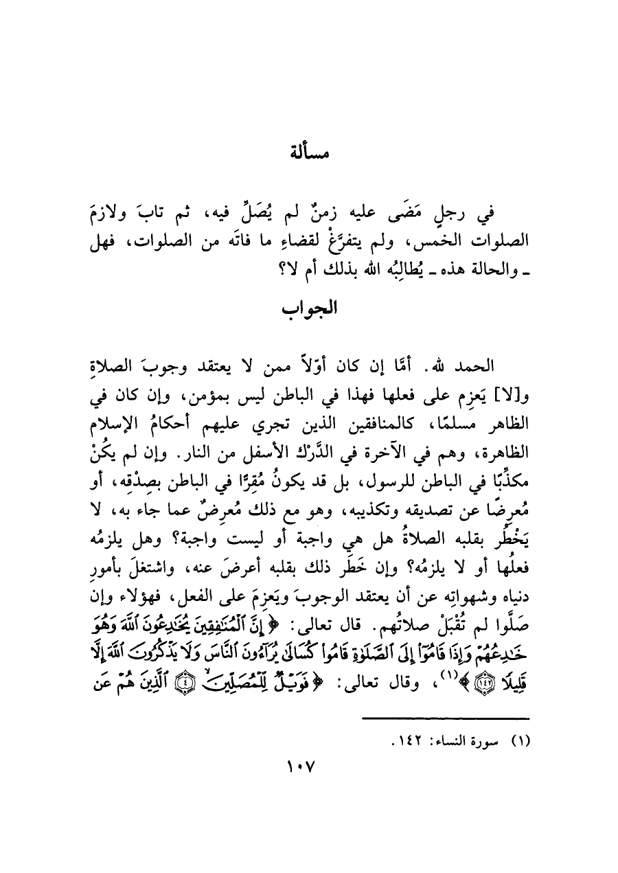 الحمد لله. أمَّا إن كان أوّلاً ممن لا يعتقد وجوبَ الصلاةِ ويَعزِم على فعلها فهذا في الباطن ليس بمؤمن، وإن كان في الظاهر مسلمًا، كالمنافقين الذين تجري عليهم أحكامُ الإسلام الظاهرة، وهم في الآخرة في الدَّرْك الأسفل من النار. وإن لم يكُنْ مكذِّبًا في الباطن للرسول، بل قد يكونُ مُقِرًّا في الباطن بصِدْقِه، أو مُعرِضًا عن تصديقه وتكذيبه، وهو مع ذلك مُعرِضٌ عما جاء به، لا يَخْطُر بقلبه الصلاةُ هل هي واجبة أو ليست واجبة؟ وهل يلزمُه فعلُها أو لا يلزمُه؟ وإن خَطَر ذلك بقلبه أعرضَ عنه، واشتغلَ بأمورِ دنياه وشهواتِه عن أن يعتقد الوجوبَ ويَعزِمَ على الفعل، فهؤلاء وإن صَلَّوا لم تُقْبَلْ صلاتُهم. قال تعالى: (إِنَّ الْمُنَافِقِينَ يُخَادِعُونَ اللَّهَ وَهُوَ خَادِعُهُمْ وَإِذَا قَامُوا إِلَى الصَّلاةِ قَامُوا كُسَالَى يُرَاؤُونَ النَّاسَ وَلا يَذْكُرُونَ اللَّهَ إِلَّا قَلِيلاً (١٤٢)) (¬١)،