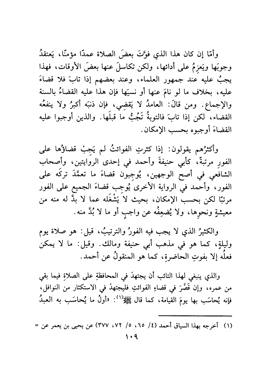 وأكثرُهم يقولون: إذا كثرتِ الفوائتُ لم يَجبْ قضاؤُها على الفورِ مرتبةً، كأبي حنيفةَ وأحمد في إحدى الروَايتين، وأصحاب الشافعي في أصح الوجهين، يُوجِبون قضاءَ ما تعمَّدَ تركَه على الفور، وأحمد في الرواية الأخرى يُوجب قضاءَ الجميع على الفور مرتبًا لكن بحسب الإمكان، بحيث لَا يَشْغَله عما لا بدَّ له منه من معيشةٍ ونحوِها، ولا يُضعِفُه عن واجبٍ أو ما لا بُدَّ منه.