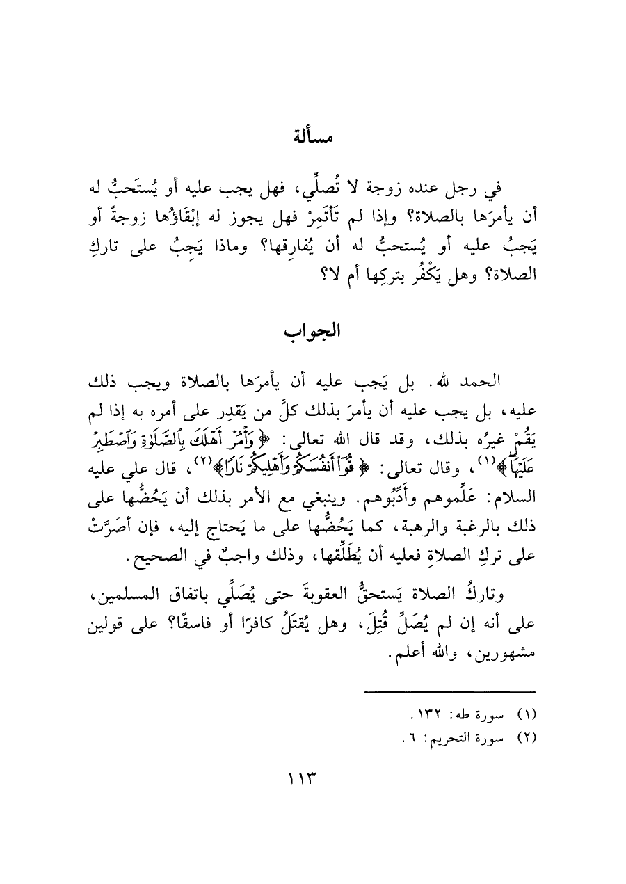 الحمد لله. بل يَجب عليه أن يأمرَها بالصلاة ويجب ذلك عليه، بل يجب عليه أن يأمرَ بذلك كلَّ من يَقدِر على أمره به إذا لم يَقُم غيرُه بذلك، وقد قال الله تعالى: (وَأْمُرْ أَهْلَكَ بِالصَّلاةِ وَاصْطَبِرْ عَلَيْهَا) (¬١)، وقال تعالى: (قُوا أَنْفُسَكُمْ وَأَهْلِيكُمْ نَاراً) (¬٢)، قال علي عليه السلام: عَلِّموهم وأَدِّبُوهم. وينبغي مع الأمر بذلك أن يَحُضُّها على ذلك بالرغبة والرهبة، كما يَحُضها على ما يَحتاج إليه، فإن أصَرَّتْ على تركِ الصلاةِ فعليه أن يُطَلِّقها، وذلك واجبٌ في الصحيح.