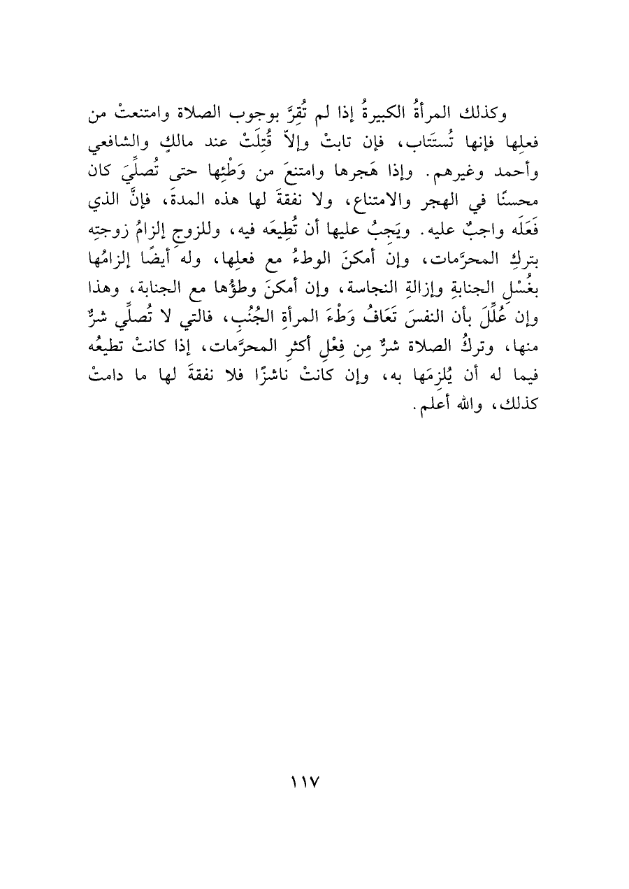 وكذلك المرأةُ الكبيرةُ إذا لم تُقِرَّ بوجوب الصلاة وامتنعتْ من فعلِها فإنها تُستَتاب، فإن تابتْ وإلاّ قُتِلَتْ عند مالكٍ والشافعي وأحمد وغيرهم. وإذا هَجرها وامتنعَ من وَطْئِها حتى تُصلِّيَ كان محسنًا في الهجر والامتناع، ولا نفقةَ لها هذه المدةَ، فإنَ الذي فَعَلَه واجبٌ عليه. ويَجبُ عليها أن تُطِيعَه فيه، وللزوج إلزامُ زوجتِه بتركِ المحرَّمات، وإنَ أمكنَ الوطءُ مع فعلِها، ولهَ أيضًا إلزامُها بغُسْلِ الجنابةِ وإزالةِ النجاسة، وإن أمكنَ وطؤُها مع الجنابة، وهذا وإن عُلِّلَ بأن النفسَ تَعَافُ وَطْءَ المرأةِ الجُنُب، فالتي لا تُصلِّي شرٌّ منها، وتركُ الصلاة شرٌّ مِن فِعْلِ أكثرِ المحرَّمات، إذا كانتْ تطيعُه فيما له أن يُلزِمَها به، وإن كانتْ ناشزًا فلا نفقةَ لها ما دامتْ كذلك، والله أعلم.