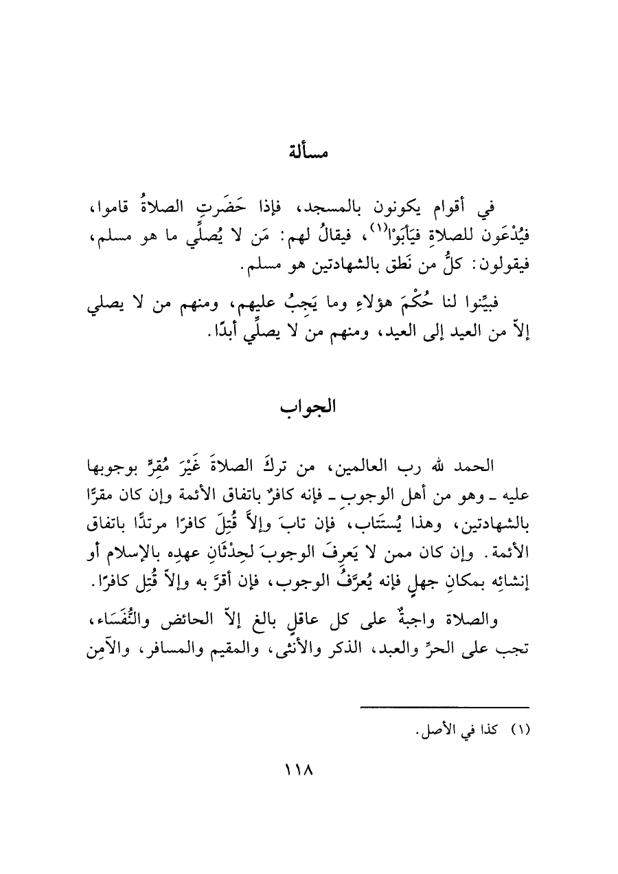 في أقوام يكونون بالمسجد، فإذا حَضَرتِ الصلاةُ قاموا، فيُدْعَون للصلاةِ فيَأبوْا (¬١)، فيقالُ لهم: مَن لا يُصلِّي ما هو مسلم، فيقولون: كل من نَطق بالشهادتين هو مسلم.