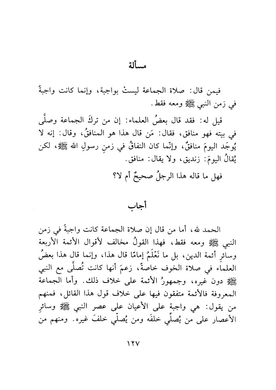 فيمن قال: صلاة الجماعة ليستْ بواجبة، وإنما كانت واجبةً في زمن النبي - صَلَّى اللَّهُ عَلَيْهِ وَسَلَّمَ - ومعه فقط.