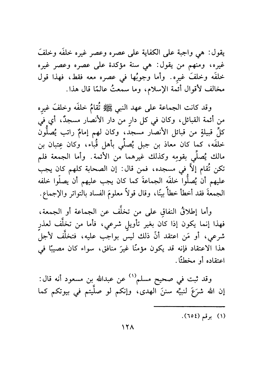 وقد كانت الجماعة على عهد النبي - صَلَّى اللَّهُ عَلَيْهِ وَسَلَّمَ - تُقامُ خلفَه وخلفَ غيرِه من أئمة القبائل، وكان في كل دارٍ من دار الأنصار مسجد، أي في كلِّ قبيلةٍ من قبائل الأنصار مسجد، وكان لهم إمام راتب يُصلُّون خلفَه، كما كان معاذ بن جبل يُصلي بأهل قُباء، وكان غَسان بن مالك يُصلِّي بقومِه وكذلك غيرهما من الأئمة. وأما الجمعة فلم تكن تُقام إلا في مسجده، فمن قال: إن الصحابة كلهم كان يجب عليهم أن يُصلوا خلفَه الجماعةَ كما كان يجب عليهم أن يصلّوا خلفه الجمعةَ فقد أخطأ خطأً بينًا، وقال قولاً معلومَ الفساد بالتواتر والإجماع.
