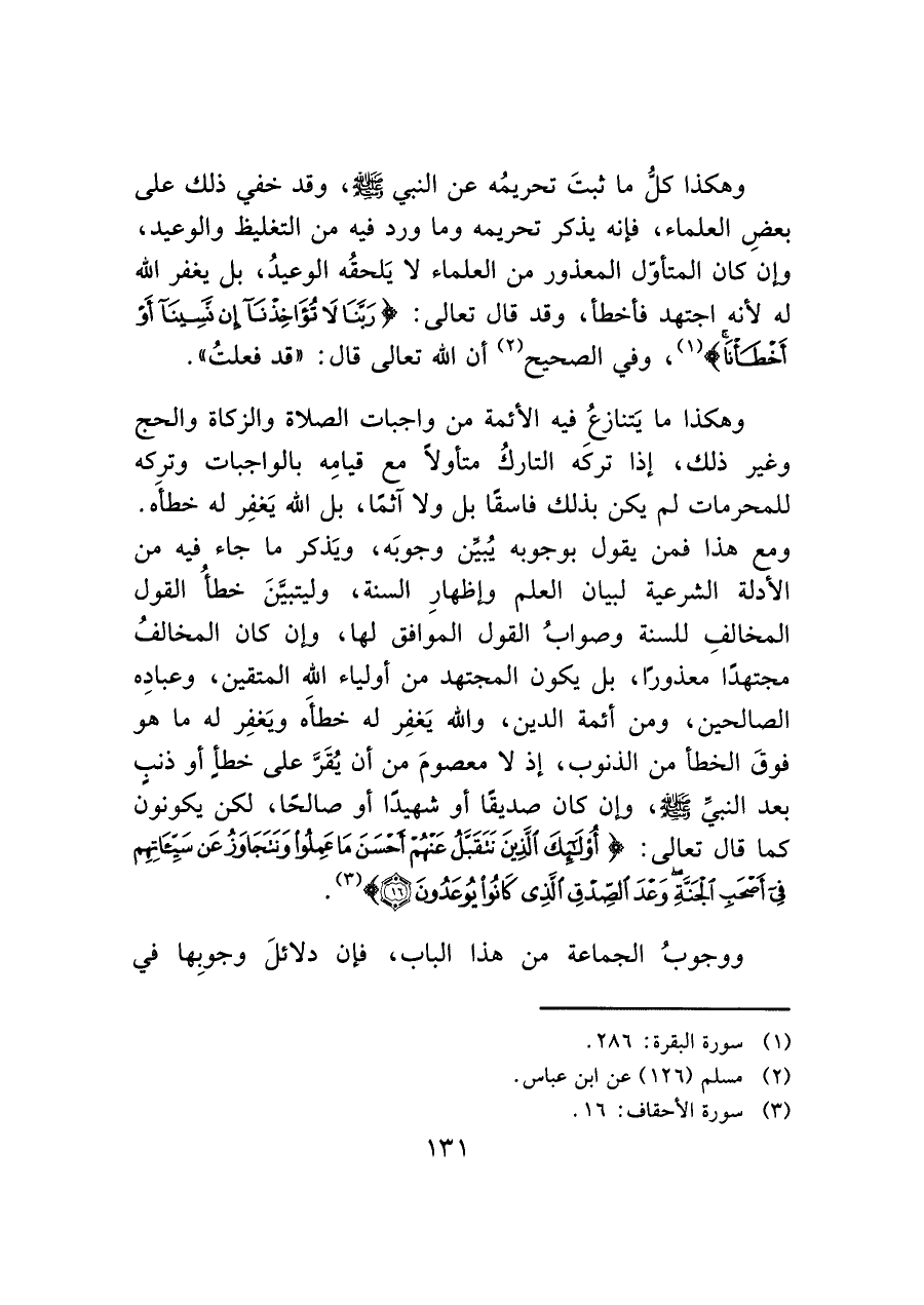 ومع هذا فمن يقول بوجوبه يُبين وجوبَه، ويَذكر ما جاء فيه من الأدلة الشرعية لبيان العلم وإظهارِ السنة، وليتبينَ خطأُ القول المخالفِ للسنة وصوابُ القول الموافق لها، وإن كان المخالفُ مجتهدًا معذورًا، بل يكون المجتهد من أولياء الله المتقين، وعبادِه الله الصالحين، ومن أئمة الدين، والله يَغفِر له خطأه ويَغفِر له ما هو فوقَ الخطأ من الذنوب، إذ لا معصومَ من أن يُقَر على خطأٍ أو ذنبٍ بعد النبي - صَلَّى اللَّهُ عَلَيْهِ وَسَلَّمَ -، وإن كان صديقًا أو شهيدًا أو صالحًا، لكن يكونون كما قال تعالى: (أُولَئِكَ الَّذِينَ نَتَقَبَّلُ عَنْهُمْ أَحْسَنَ مَا عَمِلُوا وَنَتَجاوَزُ عَنْ سَيِّئَاتِهِمْ فِي أَصْحَابِ الْجَنَّةِ وَعْدَ الصِّدْقِ الَّذِي كَانُوا يُوعَدُونَ (١٦)) (¬٣).