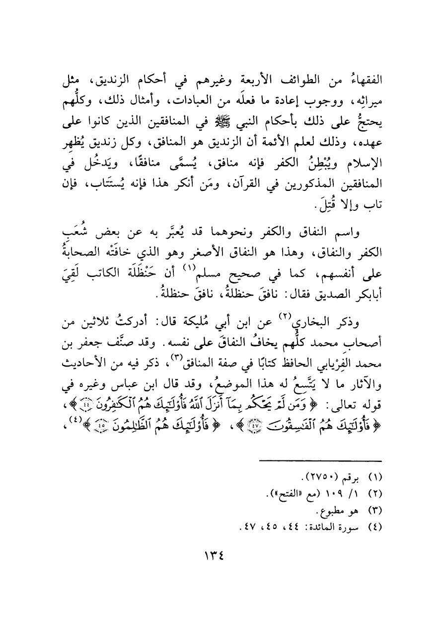وذكر البخاري (¬٢) عن ابن أبي مُليكة قال: أدركتُ ثلاثين من أصحاب محمد كلُّهم يخافُ النفاقَ على نفسه. وقد صنَّف جعفر بن محمد الفِرْيابي الحافظ كتابًا في صفة المنافق (¬٣)، ذكر فيه من الأحاديث والآثار ما لا يَتسِعُ له هذا الموضعُ، وقد قال ابن عباس وغيره في قوله تعالى: (وَمَنْ لَمْ يَحْكُمْ بِمَا أَنْزَلَ اللَّهُ فَأُولَئِكَ هُمُ الْكَافِرُونَ (٤٤))، (فَأُولَئِكَ هُمُ الْفَاسِقُونَ (٤٧))، (فَأُولَئِكَ هُمُ الظَّالِمُونَ (٤٥)) (¬٤)،