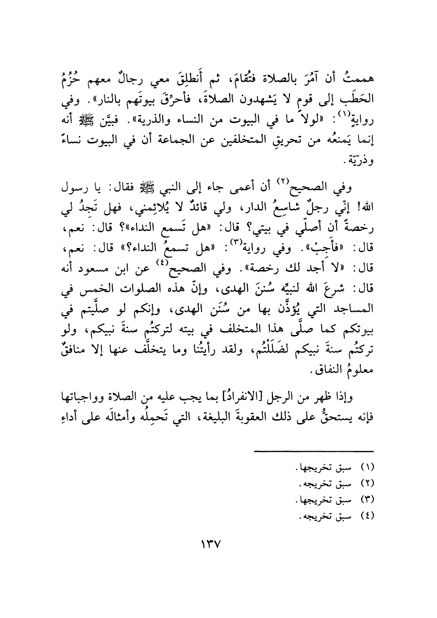 وفي الصحيح (¬٢) أن أعمى جاء إلى النبي - صَلَّى اللَّهُ عَلَيْهِ وَسَلَّمَ - فقال: يا رسول الله! إنّي رجلٌ شاسعُ الدار، ولي قائد لا يُلائِمني، فهل تَجدُ لي رخصةً أن أصلّي في بيتي؟ قال: "هل تَسمع النداء"؟ قال: نعم، قال: "فأَجبْ". وفي رواية (¬٣): "هل تسمعُ النداء؟ " قال: نعم، قال: "لا أجد لك رخصة". وفي الصحيح (¬٤) عن ابن مسعود أنه قال: شرعَ الله لنبيِّه سُننَ الهدى، وإنّ هذه الصلوات الخمس في المساجد التي يُؤذَّن بها من سُنن الهدى، وإنكم لو صلَّيتم في بيوتكم كما صلى هذا المتخلف في بيته لتركتُم سنةَ نبيكم، ولو تركتُم سنةَ نبيكم لضَلَلْتُم، ولقد رأيتُنا وما يتخلف عنها إلا منافقٌ معلومُ النفاق.