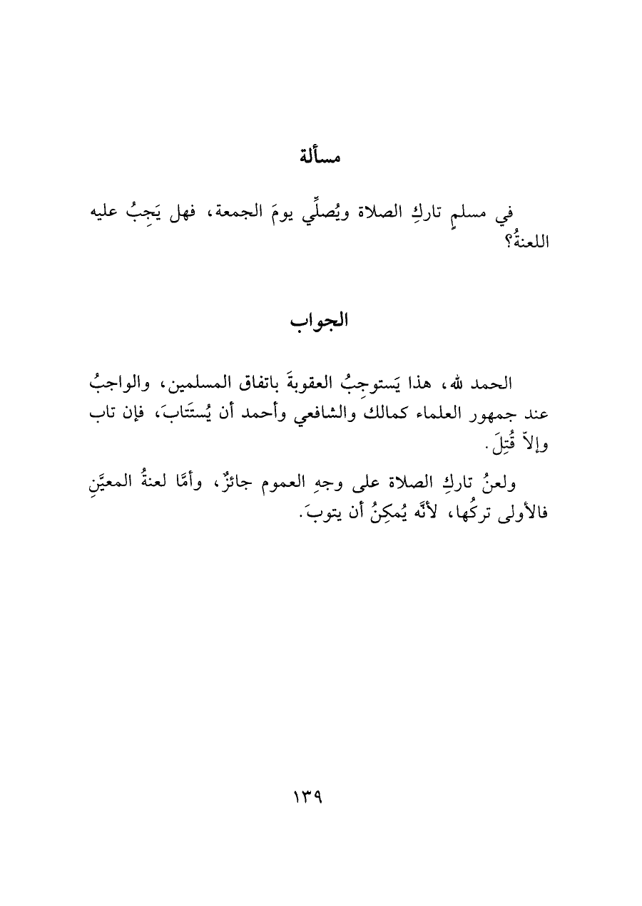 ولعنُ تاركِ الصلاة على وجهِ العموم جائزٌ، وأما لعنةُ المعينِ فالأولى تركُها، لأنه يُمكِنُ أن يتوبَ.