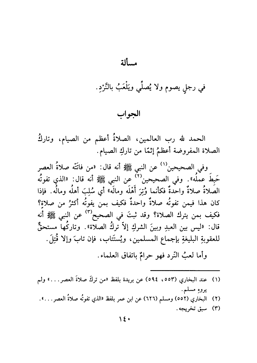 فكيف بمن يترك الصلاة؟ وقد ثبتَ في الصحيح (¬٣) عن النبي - صَلَّى اللَّهُ عَلَيْهِ وَسَلَّمَ - أنه قال: "ليس بين العبدِ وبينَ الشركِ إلاّ تركُ الصلاة". وتاركُها مستحق للعقوبةِ البليغةِ بإجماع المسلمين، ويُستَتاب، فإن تابَ وإلا قُتِلَ. وأما لعبُ النرد فهو حرامٌ باتفاق العلماء.