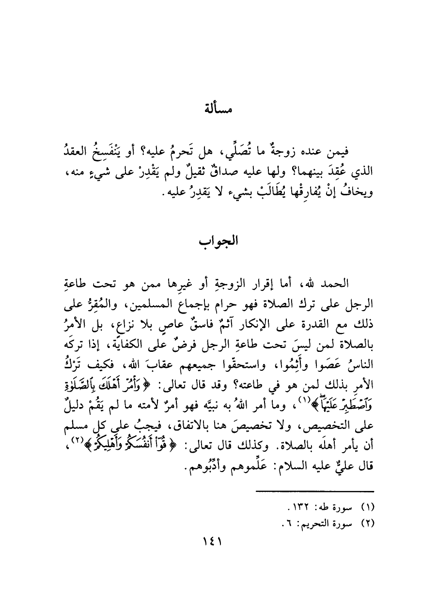 الحمد لله، أما إقرار الزوجةِ أو غيرِها ممن هو تحت طاعةِ الرجل على ترك الصلاة فهو حرام بإجماع المسلمين، والمُقِرُّ على ذلك مع القدرة على الإنكار آثم فاسقٌ عاص بلا نزاع، بل الأمرُ بالصلاة لمن ليسَ تحت طاعةِ الرجل فرض على الكفاية، إذا تركَه الناسُ عَصَوا وأَثِمُوا، واستحقوا جميعهم عقابَ الله، فكيف تَرْكُ الأمرِ بذلك لمن هو في طاعته؟ وقد قال تعالى: (وَأْمُرْ أَهْلَكَ بِالصَّلَاةِ وَاصْطَبِرْ عَلَيْهَا) (¬١)، وما أمر اللهُ به نبيه فهو أمرٌ لأمته ما لم يَقُمْ دليل على التخصيص، ولا تخصيصَ هنا بالاتفاق، فيجبُ على كل مسلم أن يأمر أهلَه بالصلاة. وكذلك قال تعالى: (قُوا أَنْفُسَكُمْ وَأَهْلِيكُمْ) (¬٢)، قال عليه الصلاة والسلام: عَلِّموهم وأدِّبُوهم.