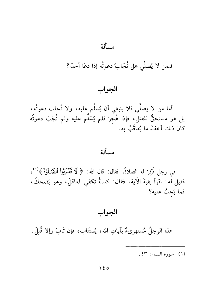 أما من لا يصلي فلا ينبغي أن يُسلَّم عليه، ولا تُجاب دعوتُه، بل هو مستحق للقتل، فإذا هُجِرَ فلم يُسَلم عليه ولم تُجَبْ دعوتُه كان ذلك أخفَّ ما يُعاقَبُ به.
