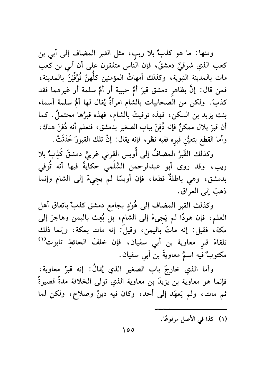 ومنها: ما هو كذب بلا ريب، مثل القبر المضاف إلى أبي بن كعب الذي شرقيَّ دمشقَ، فإن الناس متفقون على أن أبي بن كعب مات بالمدينة النبوية، وكذلك أمهاتُ المؤمنين كلُّهنّ تُوُفِّيْنَ بالمدينة، فمن قال: إنَّ بظاهرِ دمشق قبرَ أم حبيبة أو أم سلمة أو غيرهما فقد كذبَ. ولكن من الصحابيات بالشام امرأةٌ يُقال لها أم سلمة أسماء بنت يزيد بن السكن، فهذه توفيتْ بالشام، فهذه قبرُها محتملٌ. كما أن قبرَ بلال ممكنٌ فإنه دُفِنَ بباب الصغير بدمشق، فنعلم أنه دُفنَ هناك، وأما القطع بتعيُّنِ قبرِه ففيه نظر، فإنه يقال: إنّ تلك القبورَ حَدَثَتْ.