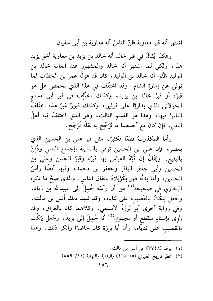 وهكذا يُقالَ في قبر خالد أنه خالد بن يزيد بن معاوية أخو يزيد هذا، ولكن لما اشتهر أنه خالد والمشهور عند العامة خالد بن الوليد ظنُّوا أنه خالد بن الوليد، كان قد عزلَه عمر بن الخطاب لما تولى عن إمارةِ الشام. وقد اختُلفَ في هذا الذي بحمص هل هو قبرُه أو قبرُ خالد بن يزيد، وكذلك اختُلِف في قبر أبي مسلمٍ الخولاني الذي بداريَّا على قولين، وكذلك قبورٌ غيرُ هذه اختَلَفَ الناسُ فيها، وهذا هو القسم الثالث، وهو الذي اختلفَ فيه أهلُ النقل، فإن كان مع أحدهما ما يُرَجِّح به نقلَه تَرَجح.