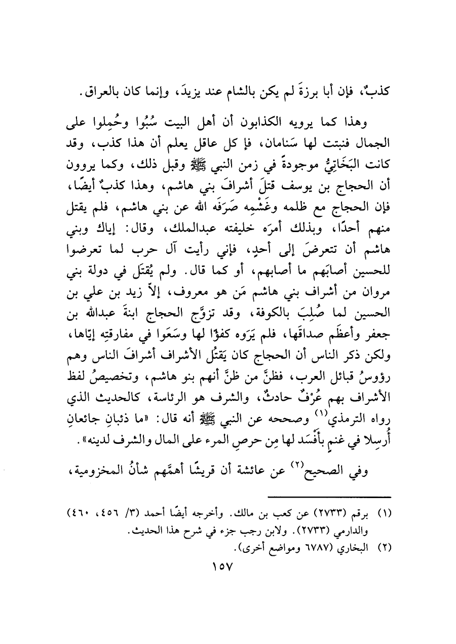 وهذا كما يرويه الكذابون أن أهل البيت سُبُوا وحُمِلوا على الجمال فنبتت لها سَنامان، فإن كل عاقل يعلم أن هذا كذب، وقد كانت البَخَاتِيُّ موجودةً في زمن النبي - صَلَّى اللَّهُ عَلَيْهِ وَسَلَّمَ - وقبل ذلك، وكما يروون أن الحجاج بن يوسف قتِلَ أشرافَ بني هاشم، وهذا كذبٌ أيضًا، فإن الحجاج مع ظلمه وغشمِه صَرَفَه الله عن بني هاشم، فلم يقتل منهم أحدًا، وبذلك أمرَه خليفته عبد الملك، وقال: إياك وبني هاشم أن تتعرضَ إلى أحدٍ، فإني رأيت آل حرب لما تعرضوا للحسين أصابَهم ما أصابهم، أو كما قال. ولم يُقتَل في دولة بني مروان من الأشراف بني هاشم مَن هو معروف، لأنّ زيد بن علي بن الحسين لما صُلِبَ بالكوفة، وقد تزوَّج الحجاج ابنةَ عبد الله بن جعفر وأعظَم صداقَها، فلم يَرَوه كفؤًا لها وسَعَوا في مفارقتِه إيّاها، ولكن ذكر الناس أن الحجاج كان يَقتُل الأشراف أشرافَ الناس وهم رؤوسُ قبائل العرب، فظنَّ من ظنَّ أنهم بنو هاشم، وتخصيصُ لفظ الأشراف بهم عُرْفٌ حادثٌ، والشرف هو الرئاسة، كالحديث الذي رواه الترمذي (¬١) وصححه عن النبي - صَلَّى اللَّهُ عَلَيْهِ وَسَلَّمَ - أنه قال: "ما ذئبانِ جائعانِ أُرسِلا في غنمٍ بأفسَد لها مِن حرصِ المرء على المال والشرف لدينه".
