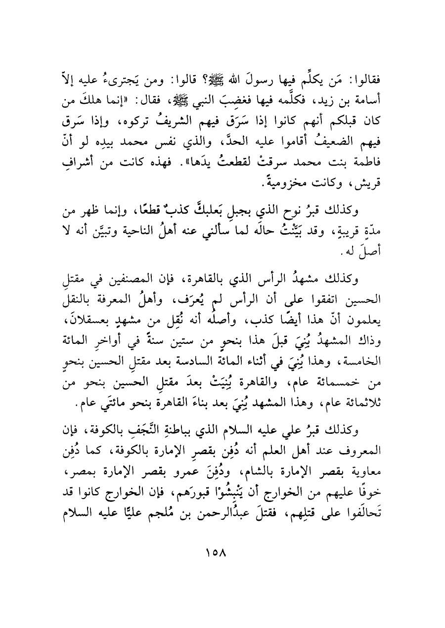 وكذلك قبرُ علي عليه السلام الذي بباطنةِ النَّجَفِ بالكوفة، فإن المعروف عند أهل العلم أنه دُفِن بقصرِ الإمارة بالكوفة، كما دُفِن معاوية بقصر الإمارة بالشام، ودُفِنَ عمرو بقصر الإمارة بمصر، خوفًا عليهم من الخوارج أن يَنْبشوْا قبورَهم، فإن الخوارج كانوا قد تَحالَفوا على قتلِهم، فقتلَ عبدُ الرحمن بن مُلجم عليًّا عليه السلام