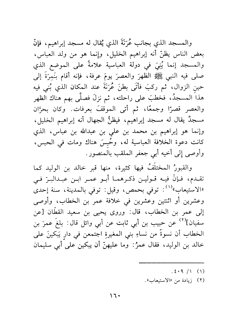 والمسجد الذي بجانب عُرَنَةَ الذي يُقال له مسجد إبراهيم، فإنّ بعض الناس يظن أنه إبراهيم الخليل، وإِنما هو من ولد العباس، والمسجد إنما بنيَ في دولة العباسية علامةً على الموضع الذي صلى فيه النبي - صَلَّى اللَّهُ عَلَيْهِ وَسَلَّمَ - الظهرَ والعصرَ يومَ عرفة، فإنه أقام بنَمِرَةَ إلى حينِ الزوال، ثم ركبَ فأتَى بطنَ عُرَنَةَ عند المكان الذي بُني فيه هذا المسجدُ، فخطبَ على راحلته، ثم نزلَ فصلَّى بهم هناك الظهر والعصر قصرًا وجمعًا، ثم أتى الموقفَ بعرفات. وكان بحرَّان مسجدٌ يقال له مسجد إبراهيم، فيظنُّ الجهال أنه إبراهيم الخليل، وإنما هو إبراهيم بن محمد بن علي بن عبد الله بن عباس، الذي كانت دعوة الخلافة العباسية له، وحُبسَ هناك ومات في الحبس، وأوصى إِلى أخيه أبي جعفر الملقب بالَمنصور.