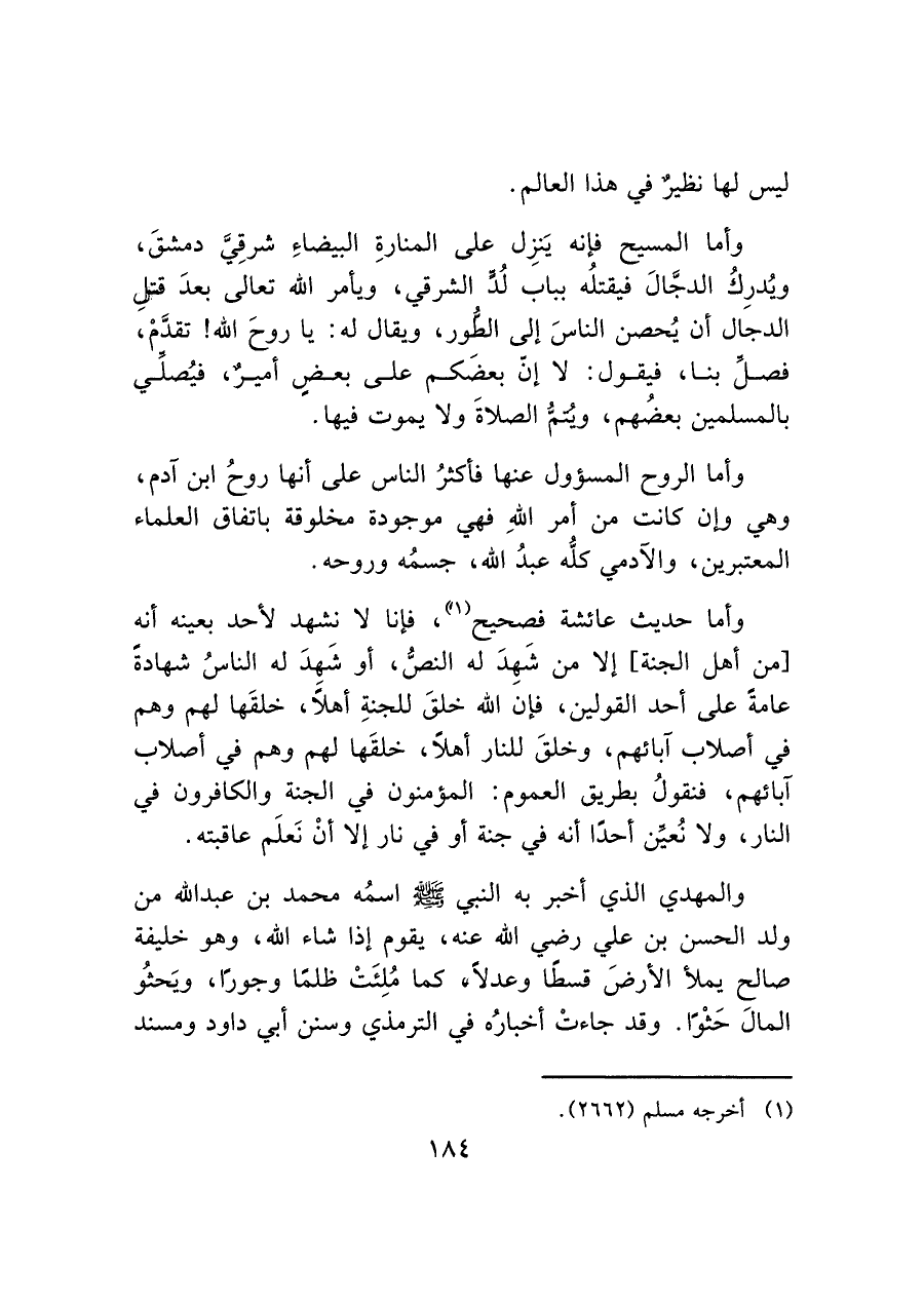 والمهدي الذي أخبر به النبي - صَلَّى اللَّهُ عَلَيْهِ وَسَلَّمَ - اسمُه محمد بن عبد الله من ولد الحسن بن علي رضي الله عنه، يقوم إذا شاء الله، وهو خليفة صالح يملأ الأرضَ قسطًا وعدلاً، كما مُلِئَتْ ظلمًا وجورًا، ويَحثُو المالَ حَثْوًا. وقد جاءتْ أخبارُه في الترمذي وسنن أبي داود ومسند