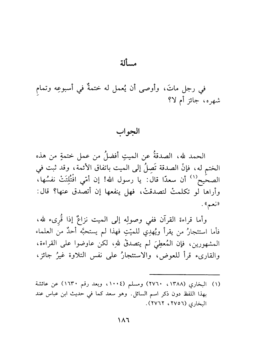 في رجل ماتَ، وأوصى أن يُعمل له ختمة في أسبوعِه وتمام شهره، جائز أم لا؟