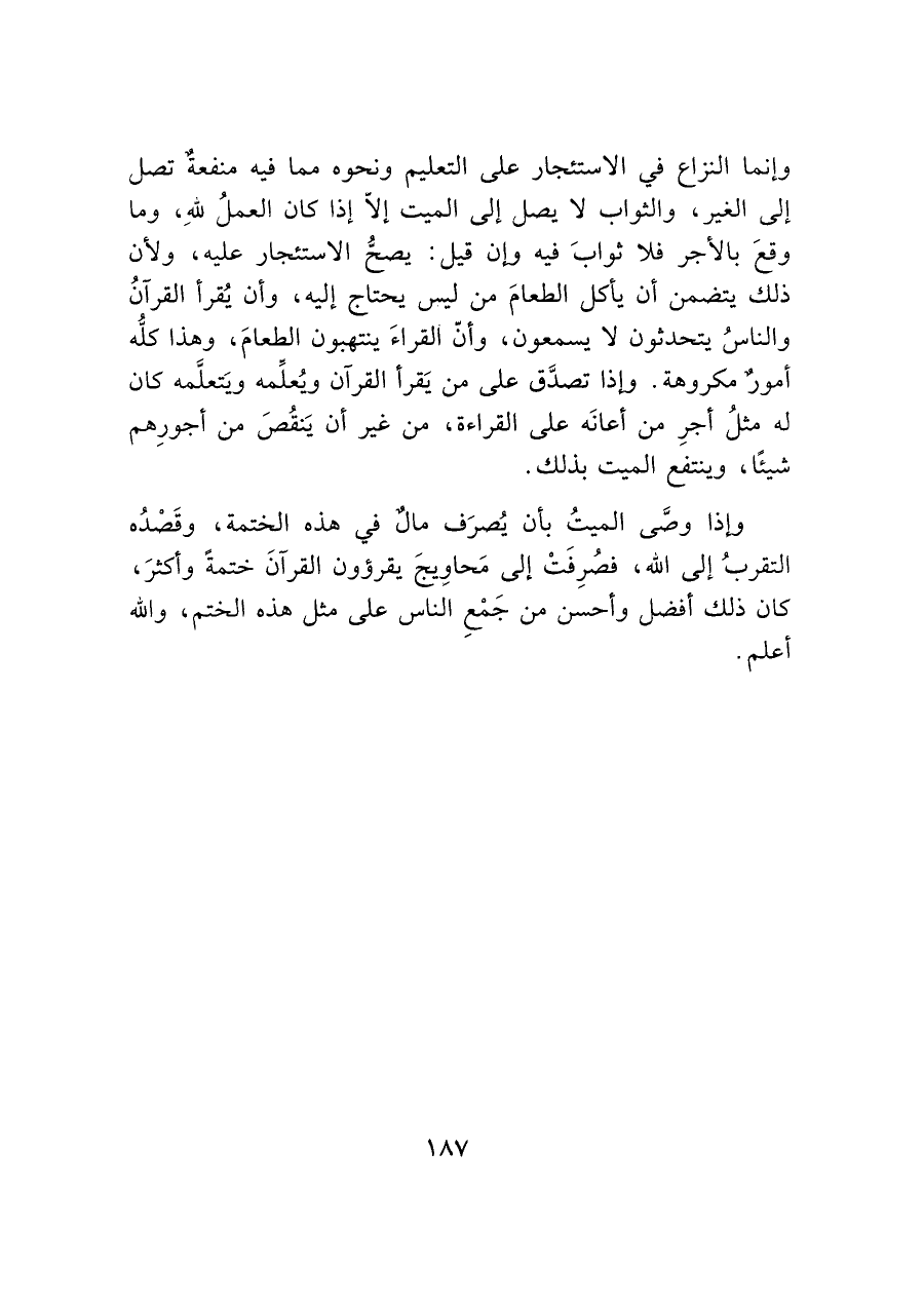 وإنما النزاع في الاستئجار على التعليم ونحوه مما فيه منفعةٌ تصل إلى الغير، والثواب لا يصل إلى الميت إلاّ إذا كان العمل للهِ، وما وقعَ بالأجر فلا ثوابَ فيه وإن قيل: يصحُّ الاستئجار عليه، ولأن ذلك يتضمن أن يأكل الطعامَ من ليس يحتاج إليه، وأن يُقرأ القرآنُ والناسُ يتحدثون لا يسمعون، وأن القراءَ ينتهبون الطعامَ، وهذا كلُّه أمورٌ مكروهة. وإذا تصدَّق على من يَقرأ القرآن ويُعلِّمه ويَتعلَّمه كان له مثلُ أجرِ من أعانَه على القراءة، من غير أن يَنقُصَ من أجورِهم شيئًا، وينتفع الميت بذلك.