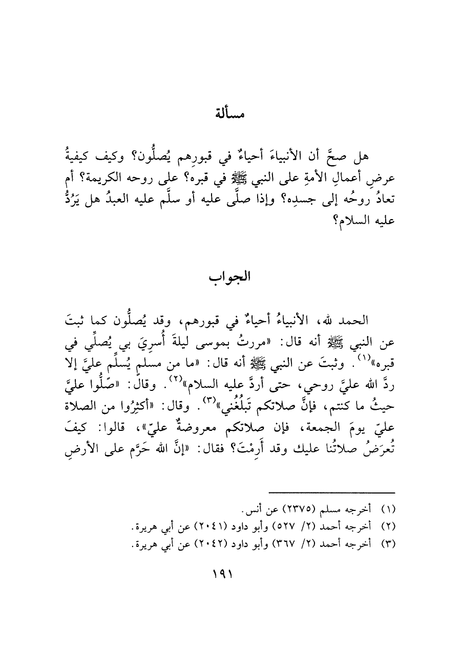 الحمد لله، الأنبياءُ أحياء في قبورهم، وقد يُصلُّون كما ثبتَ عن النبي - صَلَّى اللَّهُ عَلَيْهِ وَسَلَّمَ - أنه قال: "مررتُ بموسى ليلةَ أُسرِيَ بي يُصلِّي في قبره" (¬١). وثبتَ عن النبي - صَلَّى اللَّهُ عَلَيْهِ وَسَلَّمَ - أنه قال: "ما من مسلم يُسلِّم عليَّ إلا ردَّ الله عليَّ روحي، حتى أردَّ عليه السلام" (¬٢). وقال: "صلُّوا عليَّ حيثُ ما كنتم، فإنَّ صلاتكم تَبلُغُني" (¬٣). وقال: "أكثِرُوا من الصلاة عليّ يومَ الجمعة، فإن صلاتكم معروضةٌ عليّ"، قالوا: كيفَ تُعرَضُ صلاتُنا عليك وقد أَرِمْتَ؟ فقال: "إنَّ الله حَرَّم على الأرضِ