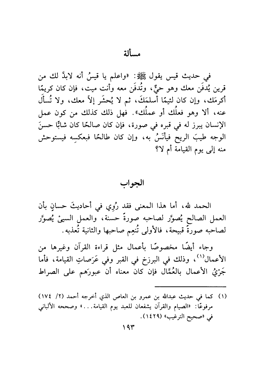 في حديث قيس يقول - صَلَّى اللَّهُ عَلَيْهِ وَسَلَّمَ -: "واعلم يا قيسُ أنه لابدَّ لك من قرين يُدفَن معك وهو حي، وتُدفَن معه وأنت ميت، فإن كان كريمًا أكرمَك، وإن كان لئيمًا أسلمَكَ، ثم لا يُحشَر إلاّ معك، ولا تُسأَل عنه، ألا وهو فعلُك أو عملُك". فهل ذلك كذلك من كون عمل الإنسان يبرز له في قبره في صورة، فإن كان صالحًا كان شابًّا حسن الوجه طيبَ الريح فيأنَسُ به، وإن كان طالحًا فبعكسِه فيستوحش منه إلى يوم القيامة أم لا؟