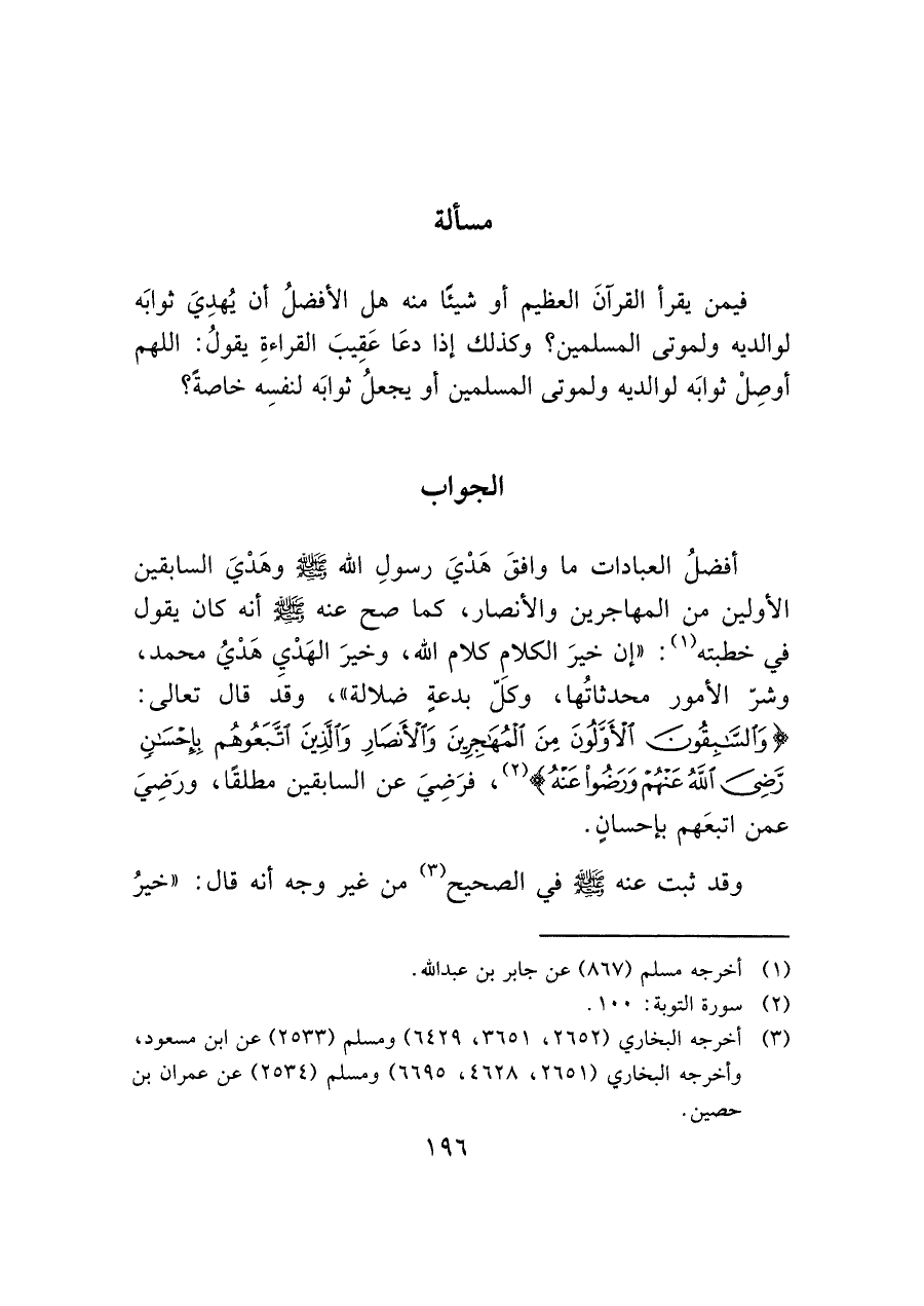 أفضلُ العبادات ما وافقَ هَدْيَ رسولِ الله - صَلَّى اللَّهُ عَلَيْهِ وَسَلَّمَ - وهَدْيَ السابقين الأولين من المهاجرين والأنصار، كما صح عنه - صَلَّى اللَّهُ عَلَيْهِ وَسَلَّمَ - أنه كان يقول في خطبته (¬١): "إن خيرَ الكلامُ كلام الله، وخيرَ الهَدْيَ هَدْيُ محمد، وشرّ الأمور محدثاتُها، وكلّ بدعةٍ ضلالة"، وقد قال تعالى: (وَالسَّابِقُونَ الْأَوَّلُونَ مِنَ الْمُهَاجِرِينَ وَالْأَنْصَارِ وَالَّذِينَ اتَّبَعُوهُمْ بِإِحْسَانٍ رَضِيَ اللَّهُ عَنْهُمْ وَرَضُوا عَنْهُ) (¬٢)، فرَضِيَ عن السابقين مطلقًا، ورَضِيَ عمن اتبعَهم بإحسان.