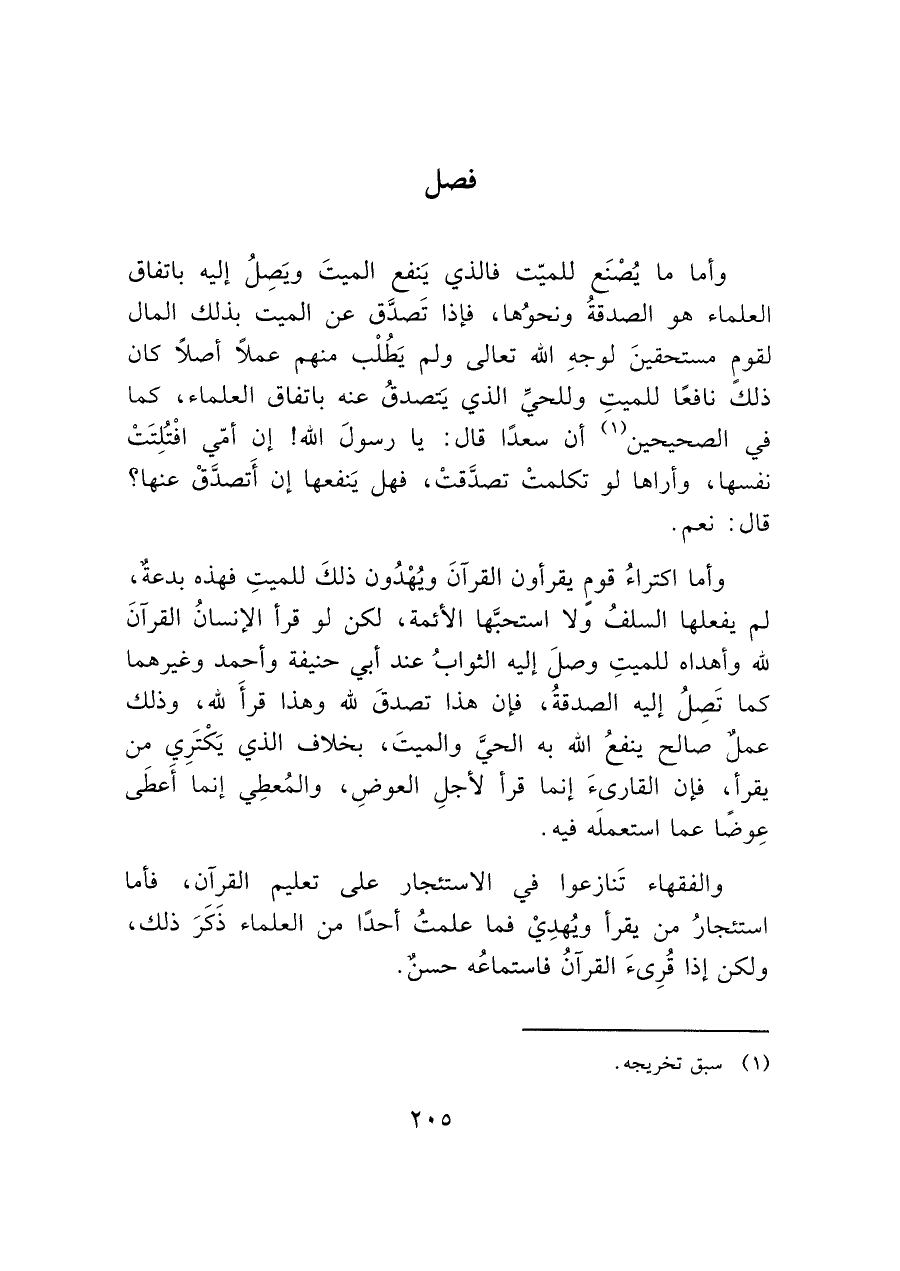 وأما ما يُصْنَع للميّت فالذي يَنفع الميتَ ويَصِلُ إليه باتفاق العلماء هو الصدقةُ ونحوُها، فإذا تَصدَّق عن الميت بذلك المال لقومٍ مستحقينَ لوجهِ الله تعالى ولم يَطُلْب منهم عملا أصلاً كان ذلك نافعًا للميتِ وللحيِّ الذي يَتصدقُ عنه باتفاق العلماء، كما في الصحيحين (¬١) أن سعدًا قال: يا رسولَ الله! إن أمي افْتُلِتَتْ نفسها، وأراها لو تكلمتْ تصدَّقتْ، فهل يَنفعها إن أَتصدَّقْ عنها؟